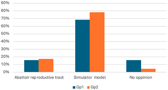 Nearly all participants (97.6%) believed it was important to train first on the simulator before attempting the procedure on live cattle [19 (100%) in Gp1 and 22 (95.7%) in Gp2], with only one participant (2.4%) from Gp2 expressing disagreement.