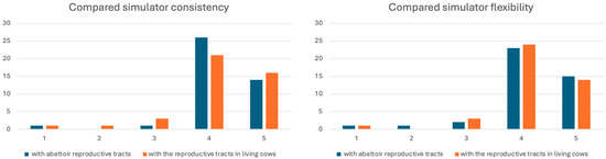 Likert scores for simulator model consistency (right) and flexibility (left) compared to reproductive tracts collected at the abattoir and in living cows.