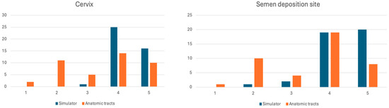 Figure 4 presents details of the perceptions of trainees on these two parameters. The simulator consistently demonstrated reduced score dispersion compared to abattoir specimens across all measured parameters, indicating more reliable and predictable training experiences. This pattern was particularly evident in cervical navigation and semen deposition assessments, where abattoir specimens showed notably greater variability in participant responses.