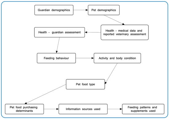 Between May and December 2020, a quantitative questionnaire was administered via the Online Surveys platform (https://www.onlinesurveys.ac.uk, accessed on 14 October 2025) to gather data from dog guardians internationally regarding their current feeding practices, acceptance of more sustainable dog diets, and information sources used for dog diet decisions. After conducting a pilot study with 25 participants, the survey was revised—primarily by reordering questions—to reduce the risks of unconscious bias affecting responses. Specifically, items related to dependent variables were placed before those concerning independent variables, except for demographic questions, which remained at the beginning. The finalized survey instrument contained 37 principal questions organized into 10 sections, as illustrated in Figure 1. Depending on their responses, some participants received additional follow-up questions. The majority of questions were multiple-choice, frequently allowing respondents to select all applicable options, resulting in predominantly nominal data. The full survey is accessible on the OSF platform (https://osf.io/nbepu/, accessed on 14 October 2025).