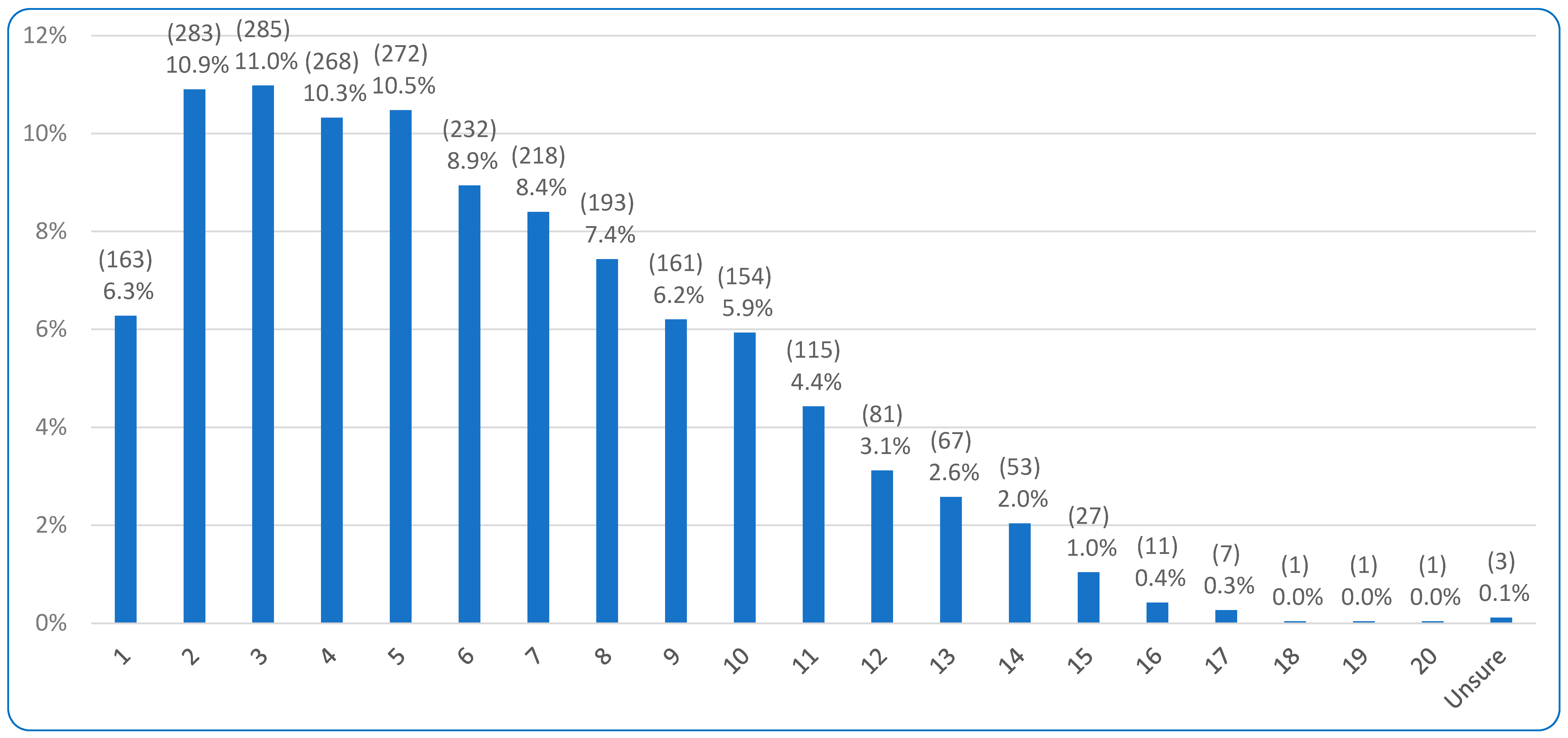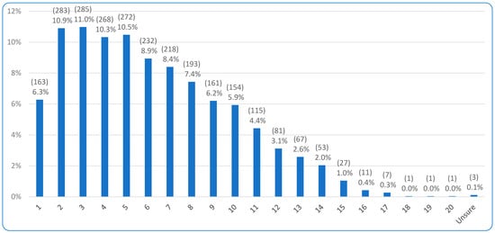 In terms of dog demographics, 98.6% (2559/2596) stated their dog was a companion animal rather than working animal. Figure 2 demonstrates the age ranges of the animals; age 3 was the most common age, selected by 11.0% of respondents (285/2596), with ages 2, 4, and 5 also represented by over 10% of respondents. The vast majority of dogs were neutered (78.2%, 2028/2596), which equated to 81.8% of female dogs (1001/1224) and 74.9% of male dogs (1027/1372). Additionally, almost all dogs (95.9%, 2489/2596) did not have specific high energy requirements (e.g., high levels of exercise, lactating, or pregnant), and 95.2% (2472/2596) were not on a prescription diet. Indeed, 94.2% (2446/2596) of respondents stated their dog was either ‘Healthy’ (61.6%, 1600/2596) or ‘Generally healthy’ (32.6%, 846/2596). Additionally, there was a wide distribution of small (20.1%, 521/2596), medium (38.8%, 1008/2596), and large (34.2%, 889/2596) dogs, along with a few giant (4.4%, 113/2596) and toy (2.5%, 65/2596) dogs.