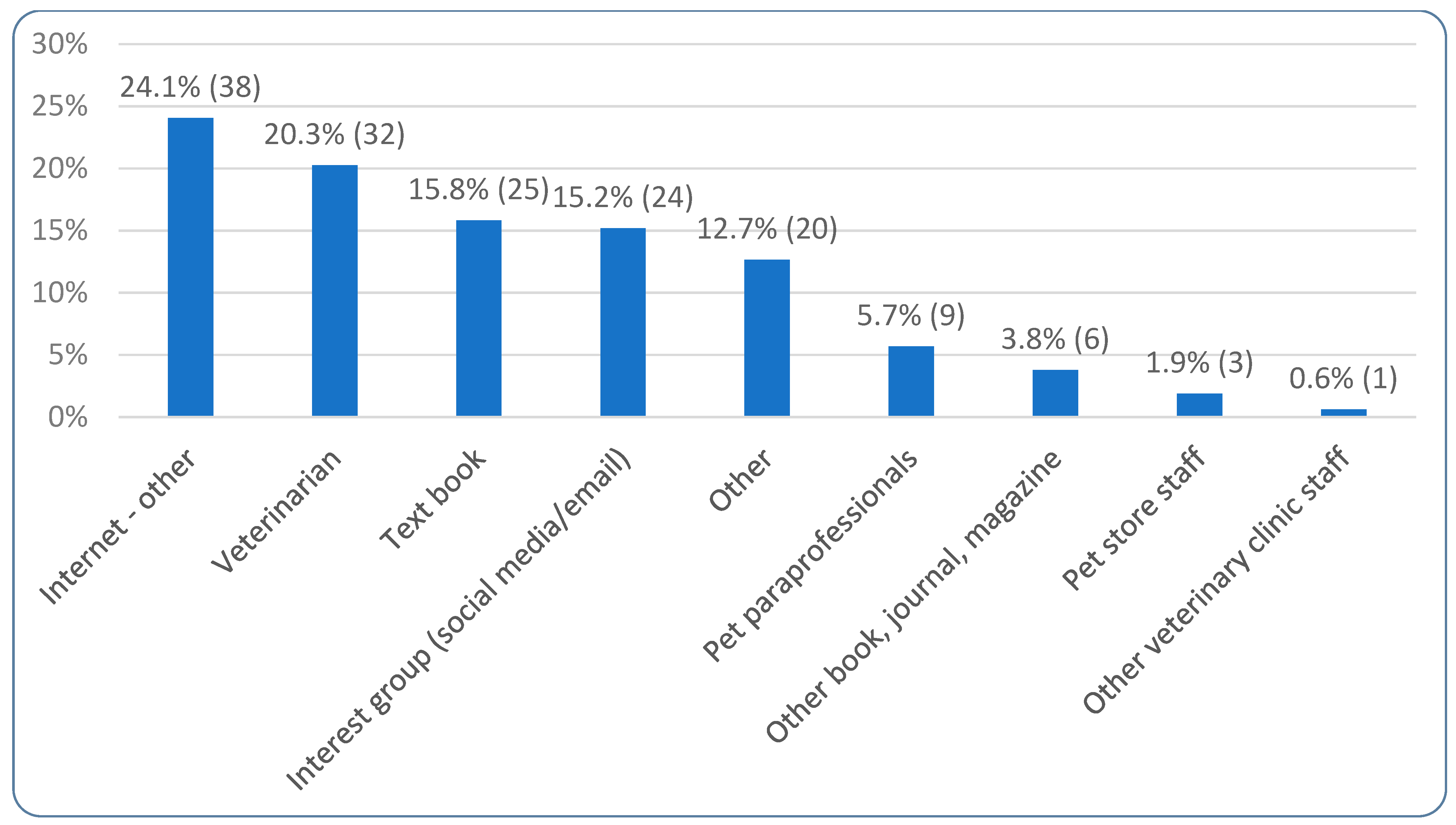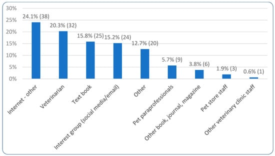 Table 2 demonstrates the diets primarily fed to the dogs, with ‘Meat-based—conventional’ comprising a majority at 52.3% (1359/2596), followed by raw meat-based diets (31.9%, 829/2596) and vegan diets (12.8%, 333/2596). Table 3 demonstrates where guardians obtain the majority of their dog food, with ‘Direct from manufacturer’ being selected most commonly by 25.6% (664/2596). Table 3 further highlights how commercial dog food comprised between 75% and 100% of the diet of nearly three quarters (71.1%, 1845/2596) of respondents’ dogs. It also highlights how the diets of respondents’ dogs were over 50% homemade in 9.8% (254/2596) of cases. Echoing this, the same table displays how up to 10.9% (285/2596) of respondents may be using homemade food as dog food, while ‘Commercial dry kibble’ is used most commonly by 37.6% (976/2596). When specifically asked if homemade food comprised more than half of their animals’ diets, 14.0% (364/2596) said ‘Yes.’ Of these 364 respondents, less than half (43.4%, 158/364) used a recipe, while 56.6% (206/364) did not. Figure 3 displays the sources for the recipes among those using a recipe, with ‘Internet’ being the most common (24.1%, 38/158).