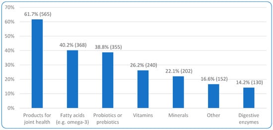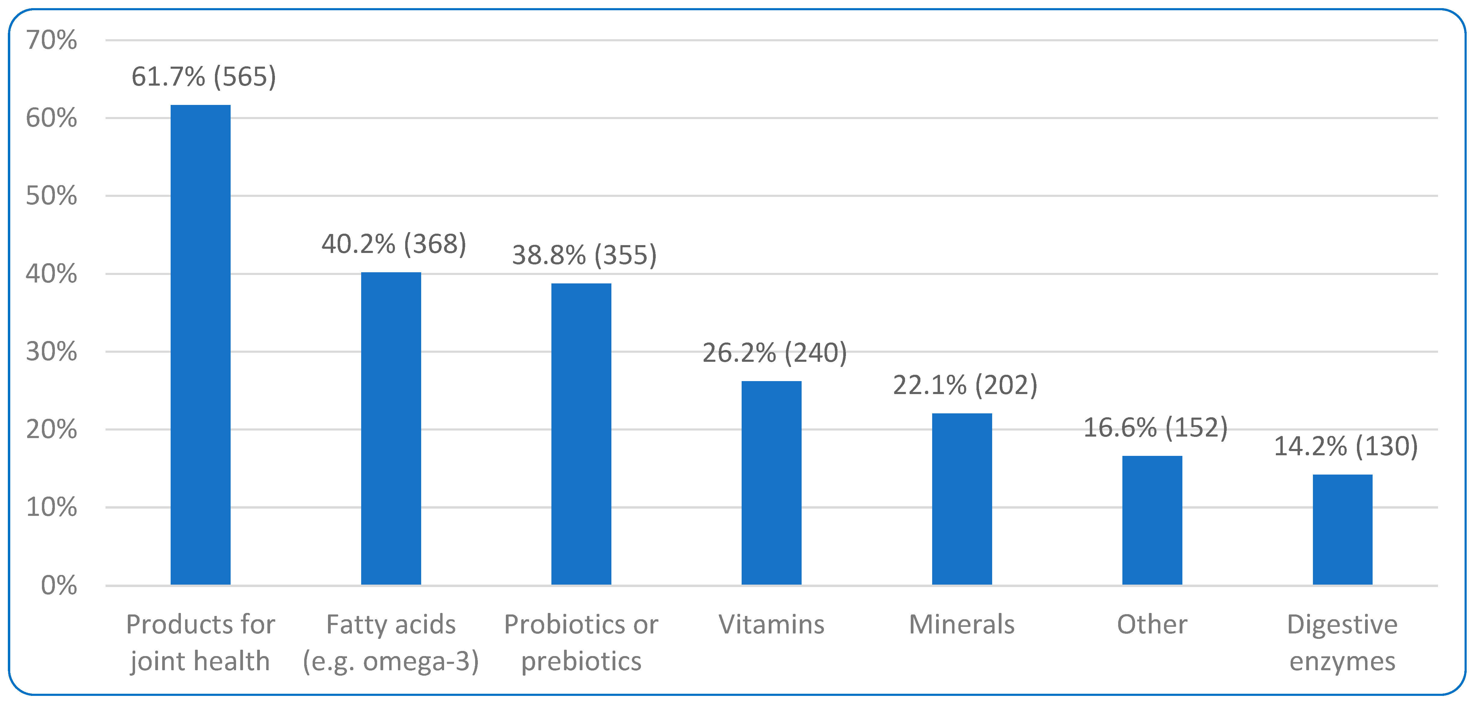 Distribution of dietary supplements given to dogs (n = 916). Note: Multiple responses were possible; thus, the percentages and counts represent the proportion of all respondents selecting each answer option.