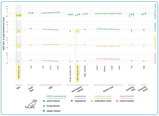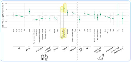 The results of the regression modeling of associations between human and dog demographics and acceptance of alternative more sustainable dog diets are shown in Figure 8 and Figure 9, respectively. The main tendencies found among human demographic variables concerned guardian diet, age, education, and region. In terms of guardian diet, there were clear tendencies of greater acceptance of all alternative diets (bar insect-based food). Vegans and vegetarians were significantly more likely to accept all 100% animal-free options, relative to omnivores. This resulted in six effects, as follows: plant-based (vegan: OR = +8662%, CI: [+5216%, +14,341%], p < 0.0001; vegetarian: OR = +972%, CI: [+538%, +1702%], p < 0.0001); fungi-based (vegan: OR = +375%, CI: [+188%, +684%], p < 0.0001; vegetarian: OR = +322%, CI: [+152%, +605%], p < 0.0001); and algae-based (vegan: OR = +304%, CI: [+145%, +565%], p < 0.0001; vegetarian: OR = +241%, CI: [+103%, +472%], p = 0.0011). An effect was also found regarding pescatarians’ higher acceptance of plant-based alternatives relative to omnivores (OR = +736%, CI: [+346%, +1468%], p < 0.0001).