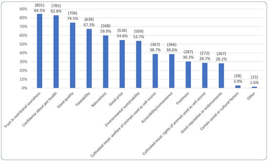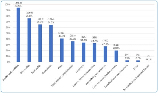 Distribution of current dog food purchasing determinants. Note: Multiple responses were possible; thus, the percentages and counts represent the proportion of all respondents (n = 2596) selecting each answer option. The ‘Other’ responses (2.7%, n = 71) comprised, for instance, ‘WSAVA standards compliant’, whether the food is vegan/organic, and avoiding allergens.