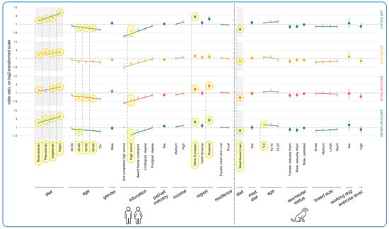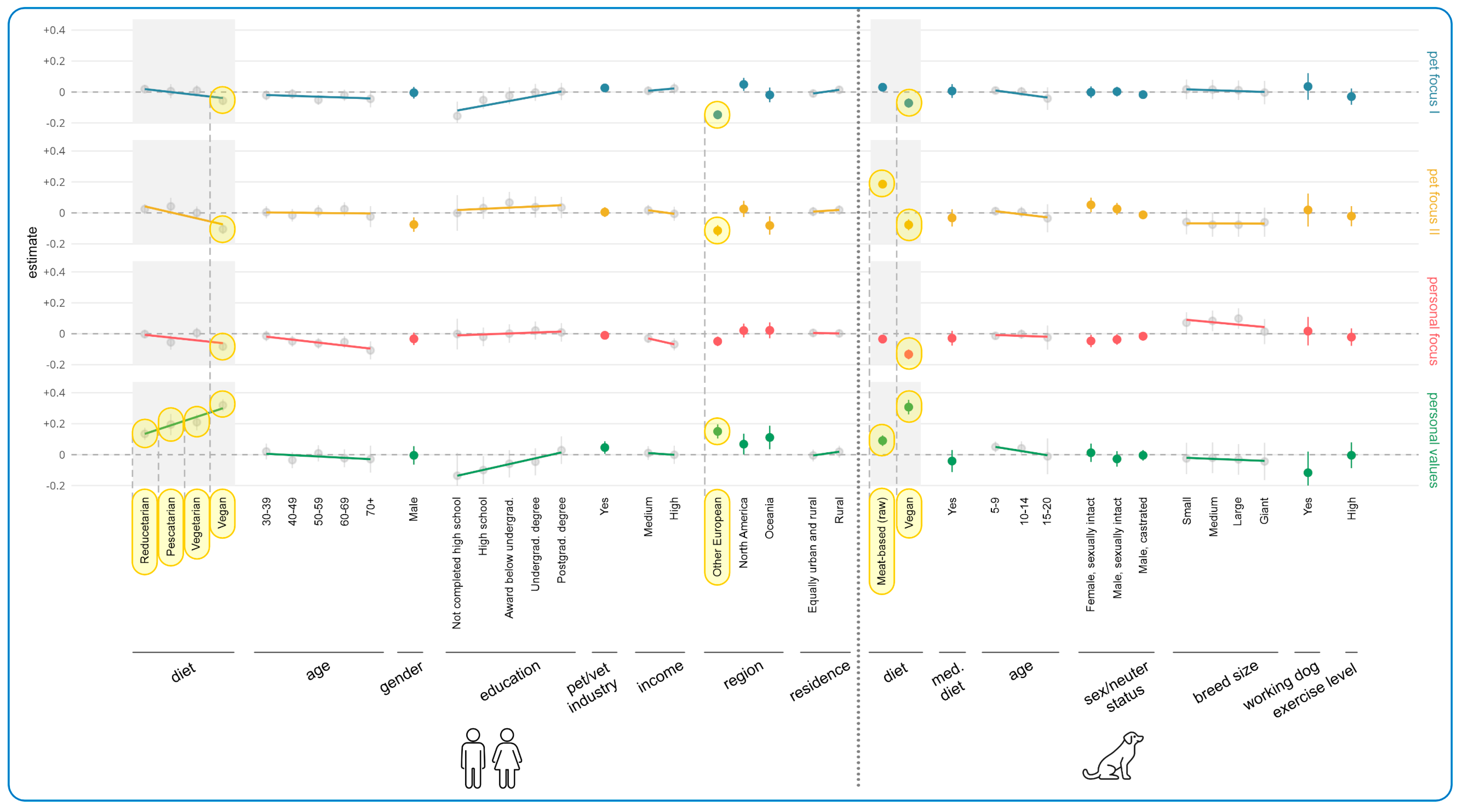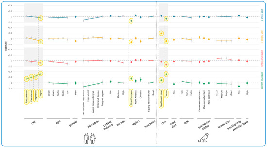 Linear regression results on the associations between human/dog demographic characteristics and current dog food purchasing determinants, relative to the reference characteristics for each group. Note: The reference characteristics for these humans and dogs were, respectively: (human) omnivore, aged 18–29, female, doctoral degree, not in pet/vet industry, low income, UK- and urban-based; (dog) meat-based (conventional), no medical diet, aged 0–4, female, spayed, toy size, a companion dog, and normal exercise levels. The right y-axis purchasing determinant categories comprise the following subitems: Pet Focus I (health and nutrition, palatability, diet quality), Pet Focus II (naturalness, freshness, diet reputation), Personal Focus (price, convenience, social/cultural aspects), and Personal Values (concerns about ‘food’ animals or sustainability). Each dependent variable (e.g., Pet Focus I) comprises a score between 0 and 1, reflecting the share of its underlying set of items (see Figures S2 and S3) that respondents ticked in the questionnaire. Effects are depicted including 95% confidence intervals (not corrected for multiple testing). Effects that are significant after multiple testing correction are highlighted with yellow bubbles. Individual estimated effects of ordinal variables are grayed out in favor of an additional linear trend line. Effects of human and dog diet are highlighted through gray-shaded areas to reflect their separate estimation scheme (i.e., these effects were estimated while not controlling for further human demographic variables) as outlined in Section 2.2.