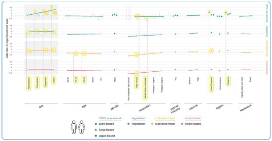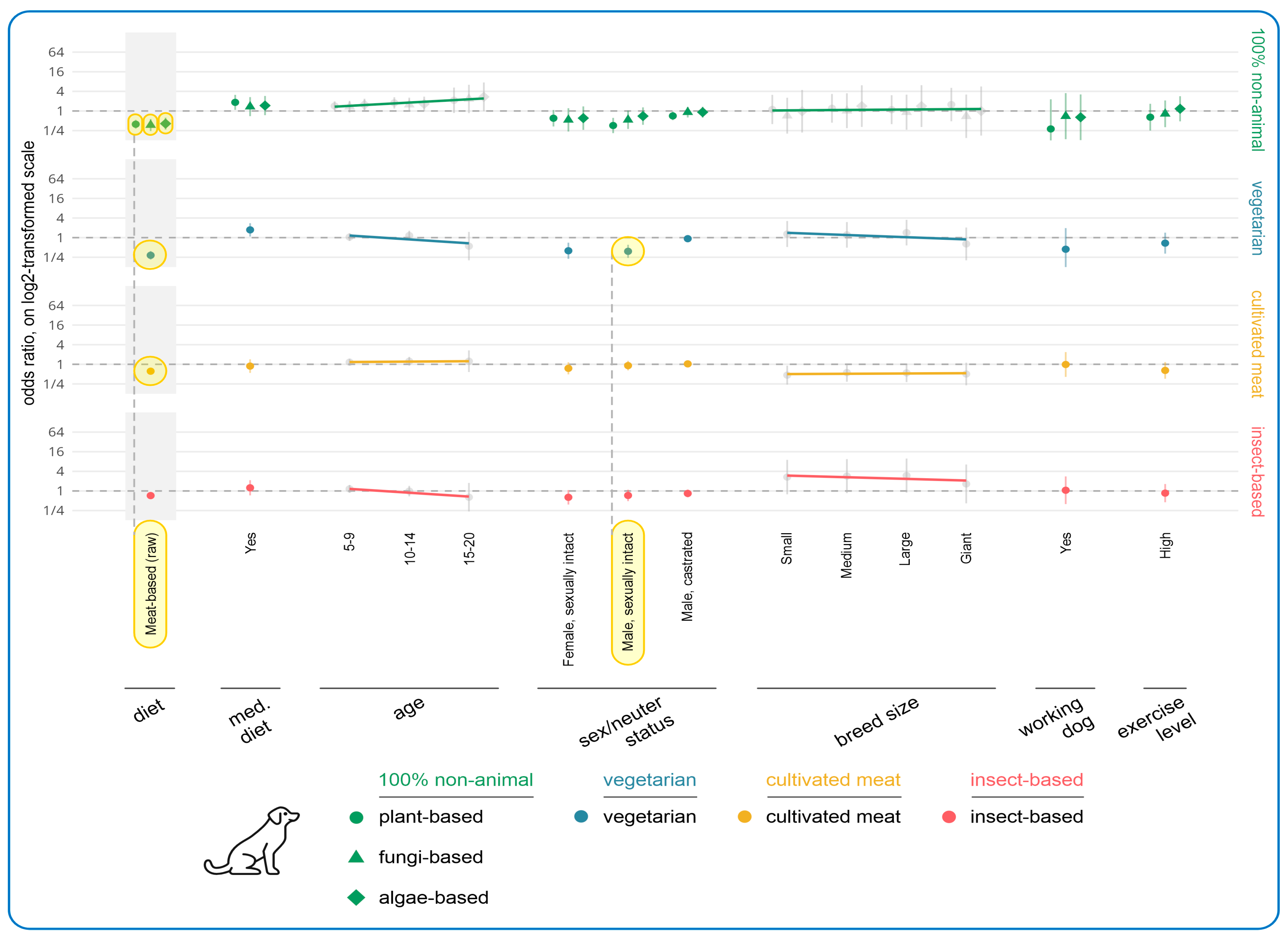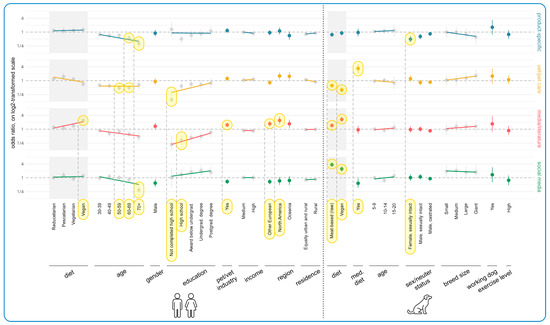Logistic regression results on the associations between human demographic characteristics and the acceptance of more sustainable dog diets, among guardians currently feeding meat-based dog food (raw or conventional), relative to the reference characteristics for each group. Note: The reference characteristics for these people were: omnivore, aged 18–29, female, doctoral degree, not in pet/vet industry, low income, UK- and urban-based. Effects are depicted as odds ratios, including 95% confidence intervals (not corrected for multiple testing). Effects that are significant after multiple testing correction are highlighted with yellow bubbles. Individual estimated effects of ordinal variables are grayed out in favor of an additional linear trend line. Effects of human diet are highlighted through gray-shaded areas to reflect their separate estimation scheme (i.e., these effects were estimated while not controlling for further human demographic variables) as outlined in Section 2.2.