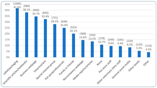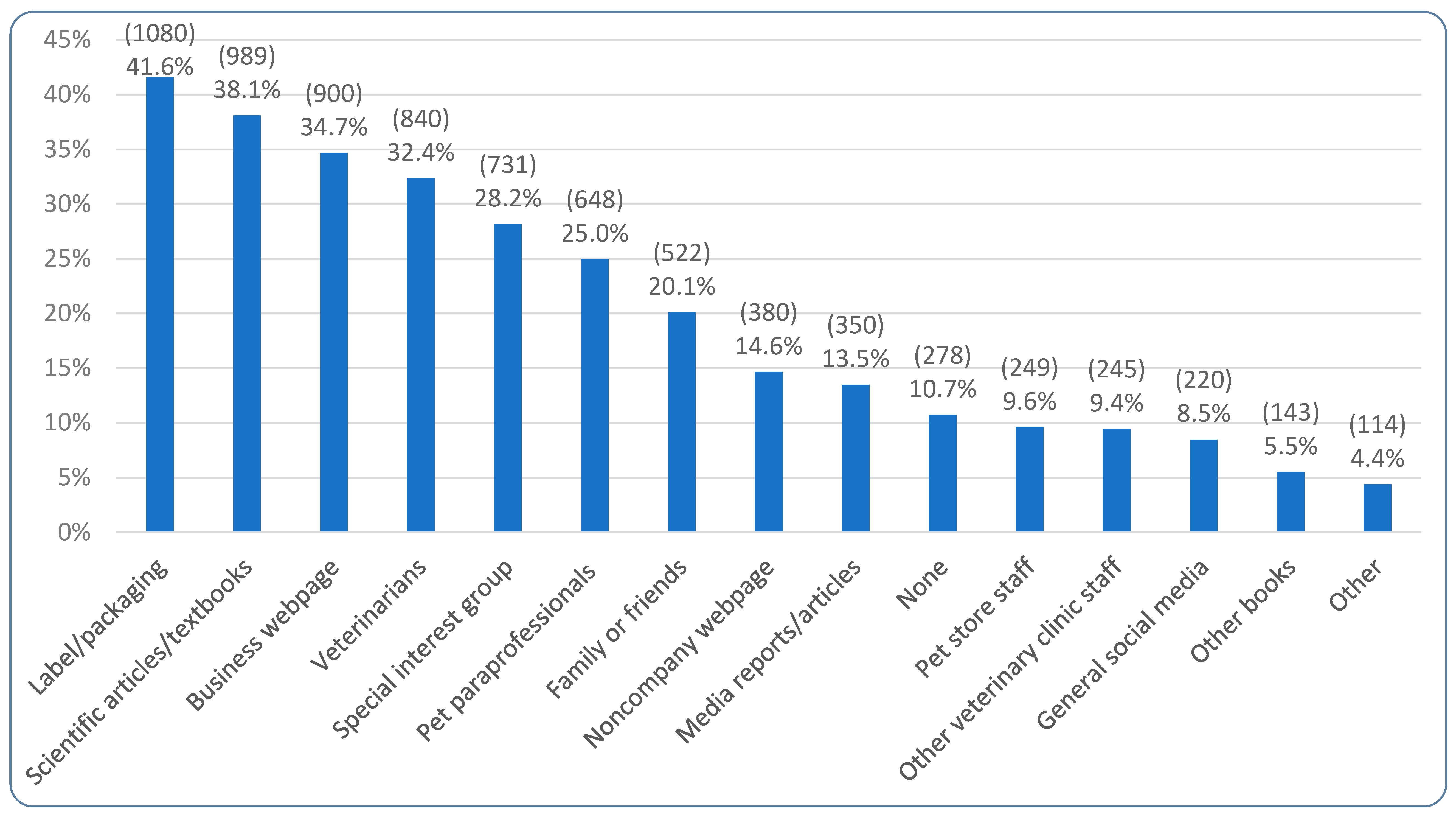 Of the 20.0% (518/2596) of respondents selecting ‘Diet reputation/endorsements’ as important (Figure 6), 510 answered the question about which endorsements they would like. A good reputation without specific endorsement was selected by 59.8% (305/510) of respondents. ‘Endorsement by veterinarians’ was selected by 37.5% (191/510), ‘Endorsement by others’ by 26.7% (136/510), and ‘Endorsement by other veterinary staff’ by 9.6% (49/510). ‘Endorsement by others’ was elaborated upon by 121 respondents; common answers included the ‘All about dog food’ website, animal behaviorists, animal nutritionists, breed experts, fellow dog guardians (same breed), others experienced with the way respondents’ dogs are fed (e.g., raw, vegan), academic researchers, WAVSA (World Small Animal Veterinary Association).