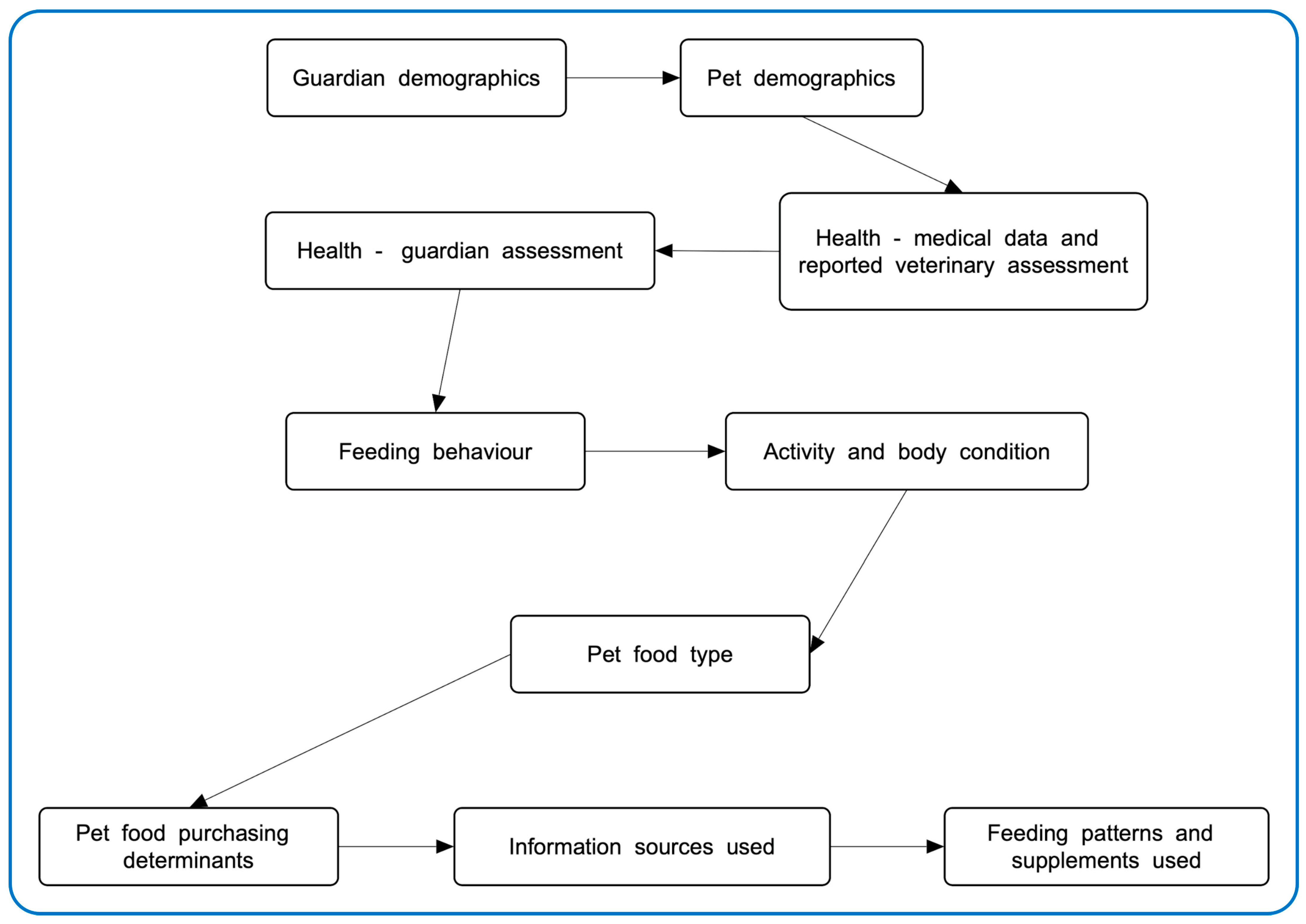 Three overarching topics were investigated: (1) existing feeding patterns and purchasing determinants among dog guardians; (2) acceptance by dog guardians of more sustainable dog diets; and (3) sources used by dog guardians to obtain information about dog diets. We analyzed these topics using the following specific research questions (RQs):
