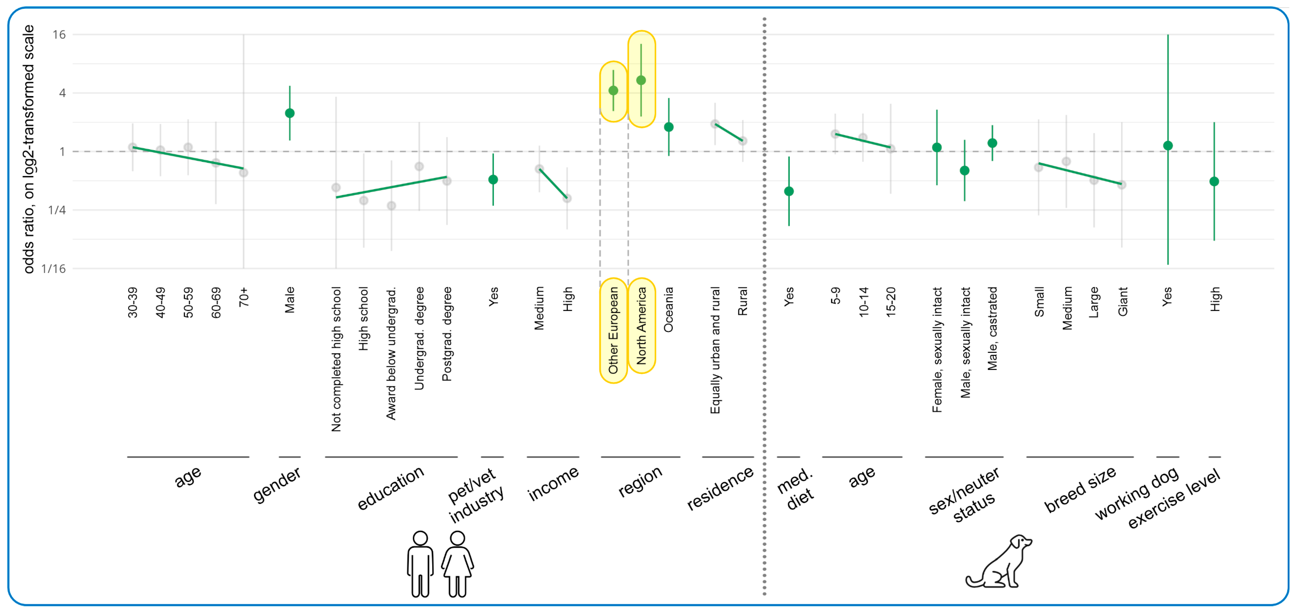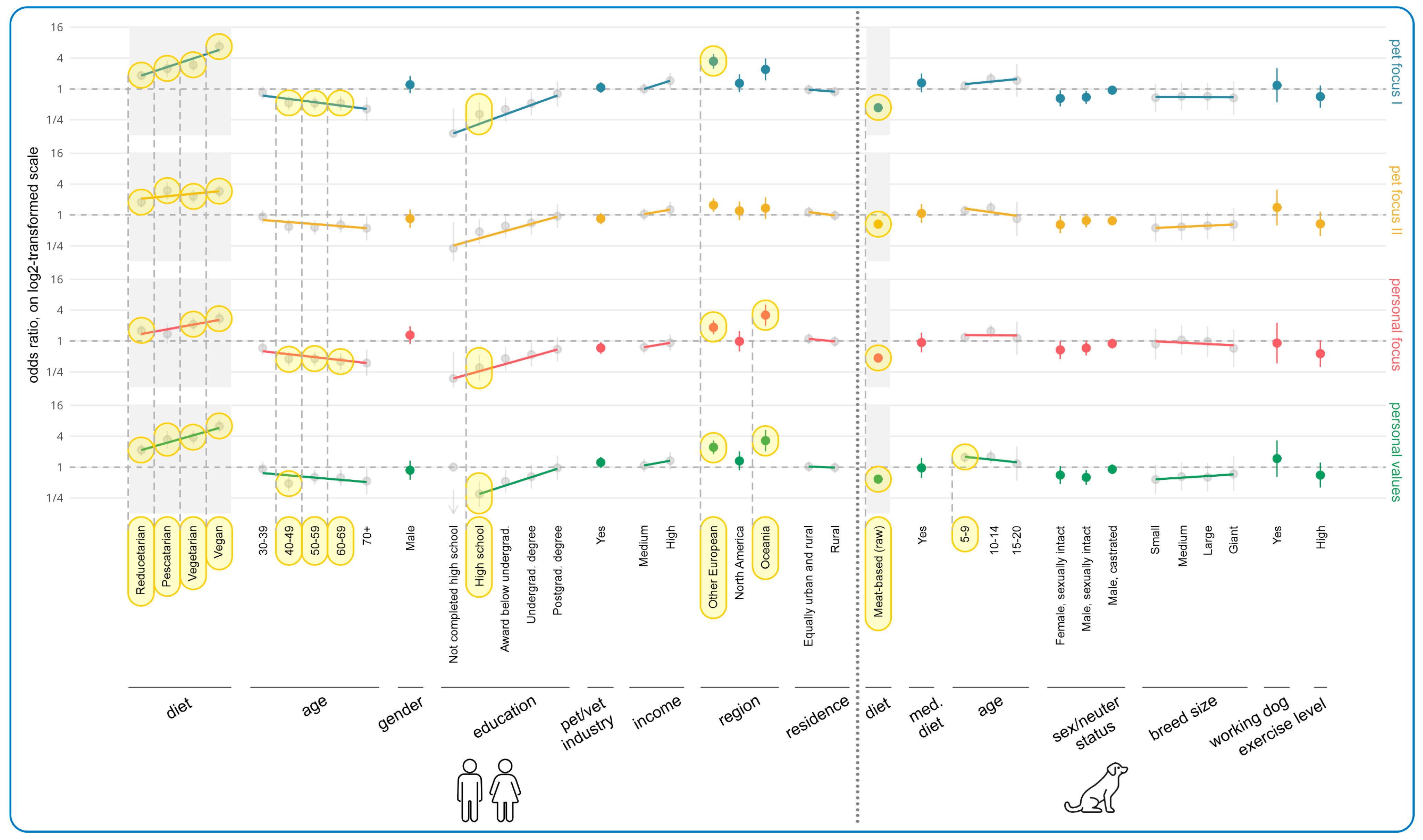 Logistic regression results on the associations between human/dog demographic characteristics and the likelihood of currently feeding vegan diets to dogs, relative to the reference characteristics for each group. Note: Vegan dog diets were almost exclusively (91.3%) fed by people who were vegan themselves. As this association was so strong, this regression analysis was run using only vegan respondents. The reference characteristics for these humans and dogs were, respectively: (human) aged 18–29, female, doctoral degree, not in pet/vet industry, low income, UK- and urban-based; (dog) no medical diet, aged 0–4, female, spayed, toy size, a companion dog, and normal exercise levels. Effects are depicted as odds ratios, including 95% confidence intervals (not corrected for multiple testing). Effects that are significant after multiple testing correction are highlighted with yellow bubbles. Individual estimated effects of ordinal variables are grayed out in favor of an additional linear trend line.