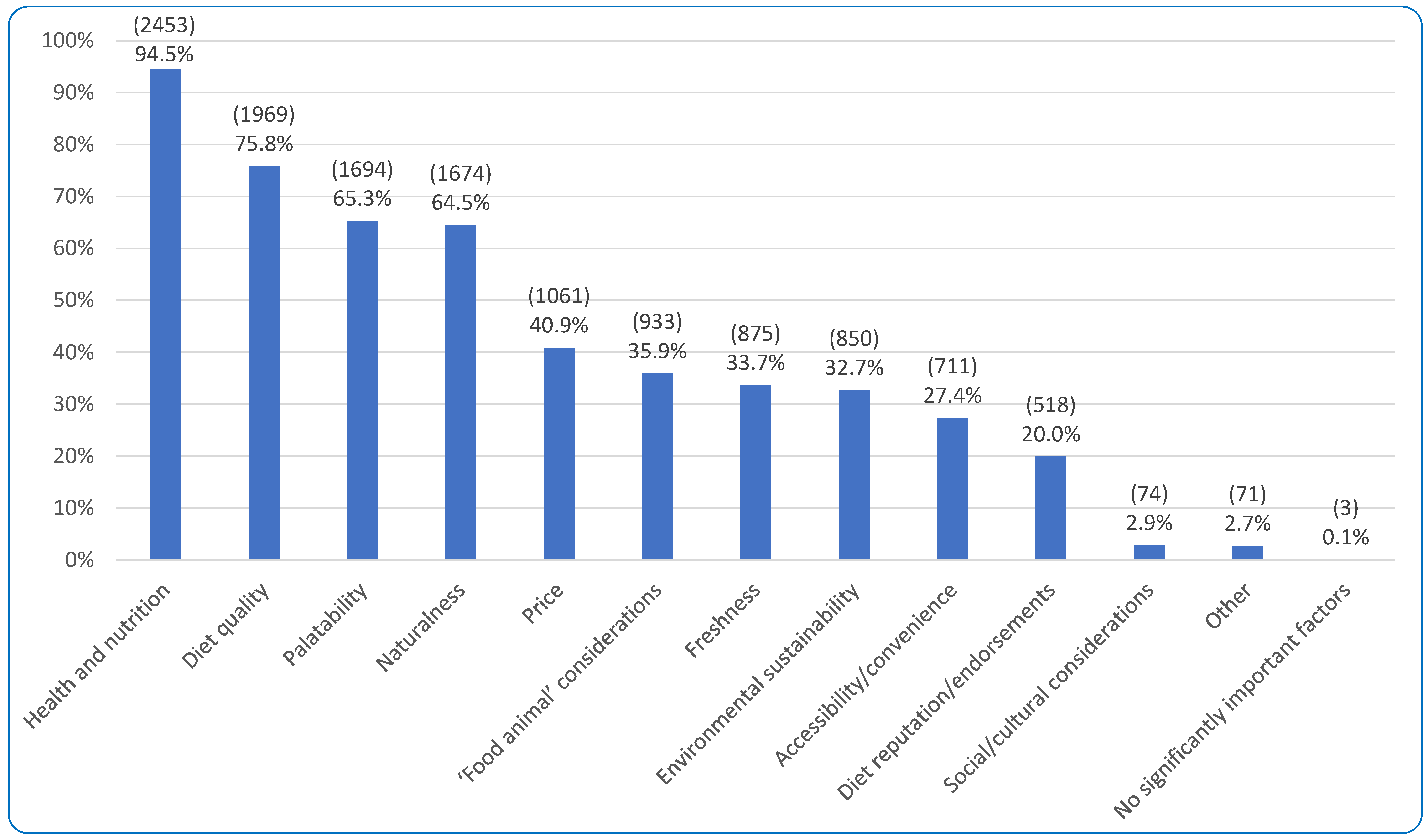 The vast majority of respondents (95.9%, 2489/2596) were the primary decision maker for pet food purchases with 4.1% (107/2596) playing a lesser role. Figure 6 portrays the most commonly selected factors of importance when choosing a dog food, with ‘Health and nutrition’ being the most popular option (selected by 94.5% of respondents, 2453/2596). When asked which health/nutritional factors were specifically important among these 94.5% of respondents, 90.1% (2211/2453) selected ‘Maintenance of pet health,’ 73.3% (1799/2453) selected ‘Nutritional soundness,’ 39.5% (968/2453) ‘Life stage suitability,’ 10.5% (258/2453) ‘Performance on diet,’ and 1.9% (47/2453) ‘Other.’ Examples of ‘Other’ included whether allergens were present, effect on bowels/stools, and safety (no recalls). When asked if there were any particular nutrients these respondents wanted included in pet food, 76.5% (1348/1763) stated ‘No’ and 23.5% (415/1763) stated ‘Yes.’ From the 412 respondents providing qualitative details following their ‘Yes’ response, common responses included all essential nutrients, meeting/exceeding FEDIAF-required levels, B12, L-carnitine, taurine, omega oils, glucosamine, chondroitin, probiotics, prebiotics, and vitamin D.