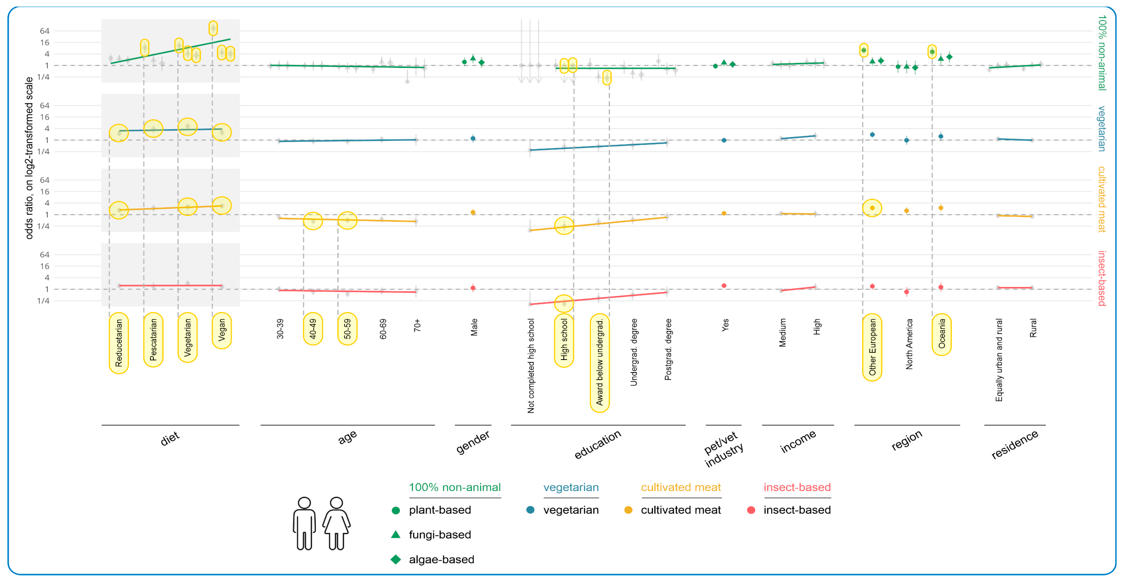 To account for the multitude of individual tests, multiple testing correction after Bonferroni-Holm [53] was applied individually for every model. Model assumptions were visually checked based on the distribution of model residuals. No relevant deviations from the assumptions could be observed. Additionally, we calculated the area under the curve (AUC) values for logistic regression models, which were calculated on a randomly selected 20% hold-out test set after re-estimating each model on the remaining 80% training set. The AUC values for RQ1a were 0.72 for the ‘vegan vs. meat-based’ model and 0.61 for the ‘conventional vs. raw meat’ model. Other AUC values ranged between 0.62 and 0.70 (RQ2a), 0.58 and 0.65 (RQ2b), and 0.61 and 0.66 (RQ3). The R2 values for the RQ1b linear regression models ranged from 0.02 to 0.06. AUC values below 0.7 are generally considered to indicate poor discrimination [54]. No such hard threshold is established for R2 values [55]. While some of our AUC and R2 values were very low, this was anticipated given our focus on modeling complex personal values and interests based almost exclusively on sociodemographic factors. In such social science research settings, low goodness-of-fit values do not necessarily indicate an uninterpretable model, but observed effect patterns and significances can and should still be interpreted [55].