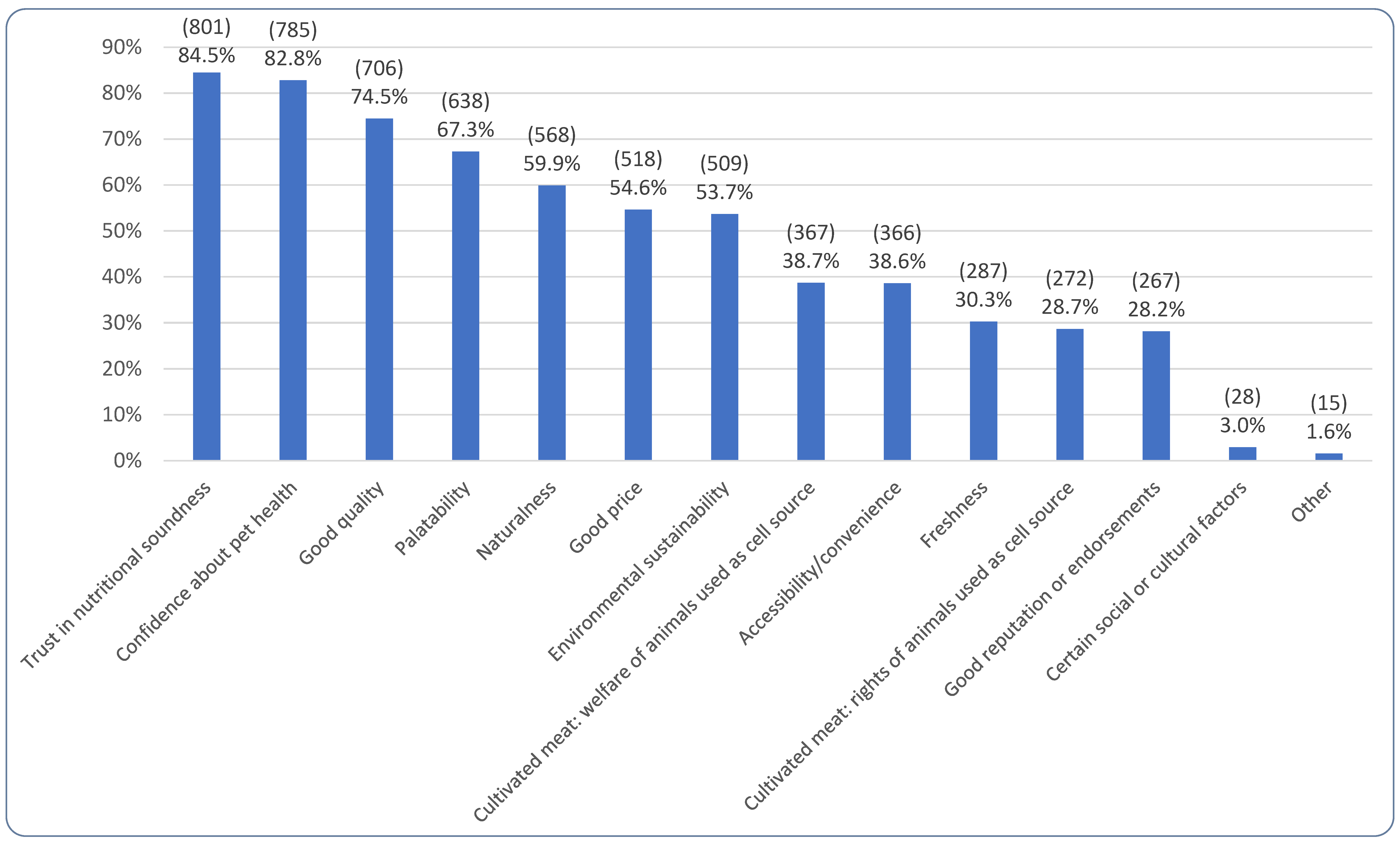 Those feeding conventional or raw meat-based diets (collectively 84.2%, 2188/2596) were asked which alternative food types they might realistically consider, assuming all their desired attributes could be met—2169 responded. Table 2 demonstrates how all of the alternatives remained unacceptable to 56.8% (1231/2169). Cultivated meat-based food was the next most common selection, chosen by 24.4% (529/2169) of respondents. Vegetarian, insect-based, and vegan options were selected by respondents to comparable extents (16.6%, 359/2169; 15.5%, 336/2169; and 13.4%, 290/2169, respectively). Included in these figures are 10 respondents who deemed all options unacceptable, but who also simultaneously selected one of the alternatives as acceptable (cultivated meat, n = 4; vegetarian, n = 3; vegan, n = 1; insect-based, n = 2).