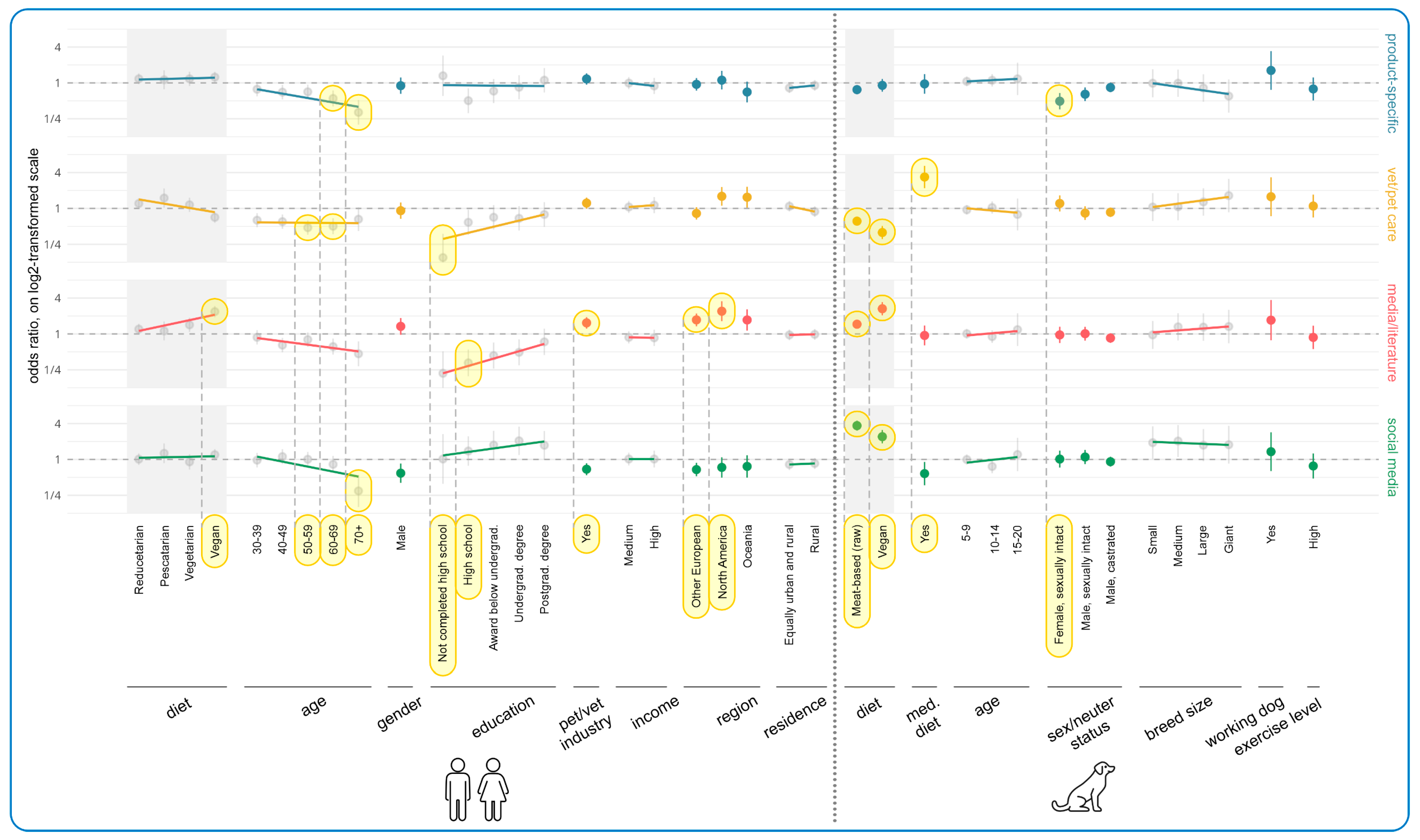 For both RQ2b and RQ3, four logistic models were estimated on four category scores, each reflecting the information if at least one of the respective items was selected. The categories for RQ2b comprised Pet Focus I (items ‘health,’ ‘palatability,’ ‘quality,’ ‘nutritional soundness’), Pet Focus II (items ‘naturalness,’ ‘freshness,’ ‘reputation’), Personal Focus (items ‘price,’ ‘convenience,’ ‘social/cultural’), and Personal Values (items ‘sustainability,’ ‘animal welfare for cultivated meat,’ ‘animal rights for cultivated meat’). For RQ3, the categories comprised Product-Specific (items ‘label/packaging,’ ‘company webpage’), Vet/Pet Care (items ‘veterinarians,’ ‘other vet clinic staff,’ ‘pet store staff,’ ‘pet paraprofessionals’), Media/Literature (items ‘scientific literature,’ ‘media reports,’ ‘non-company webpage,’ ‘other books’), and Social Media (items ‘special interest group online,’ ‘general social media’).
