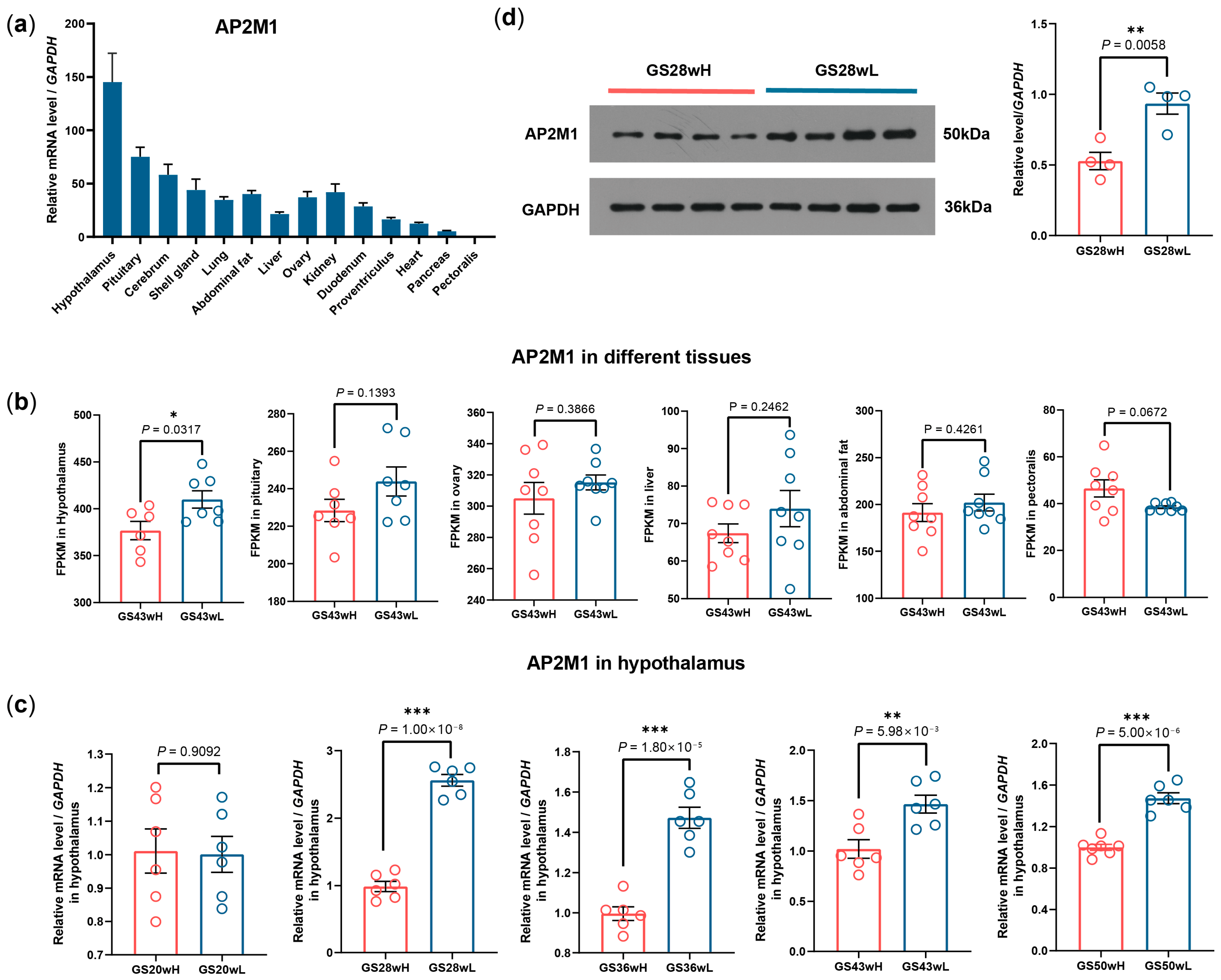 AP2M1 may serve as a unique supplementary mechanism governing chicken reproduction. However, as the current research still cannot confirm whether AP2M1 acts directly on GnRH neurons or indirectly via upstream NPVF neurons, the molecular regulatory mechanism by which
