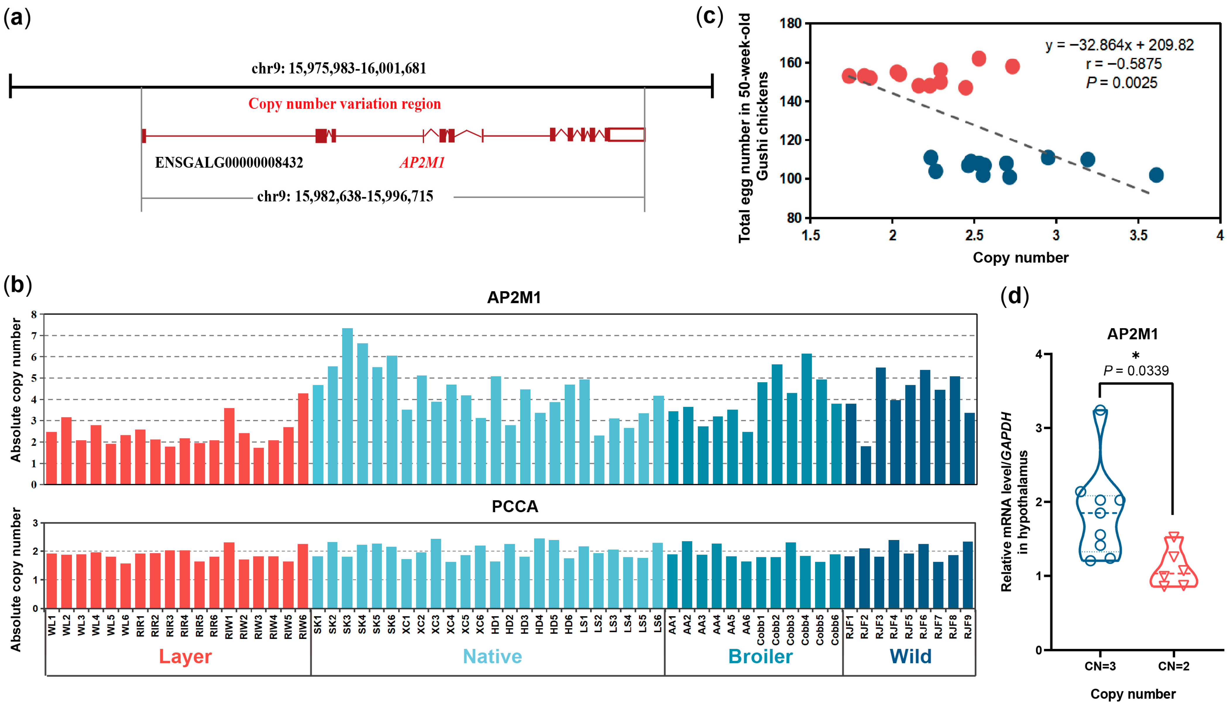 AP2M1 genomic sequence in layer breeds, native chicken breeds, and commercial broiler breeds, we found that the copy number of the CNV was the lowest in layer breeds. CNV can affect gene expression levels via containing or disrupting gene coding regions, and