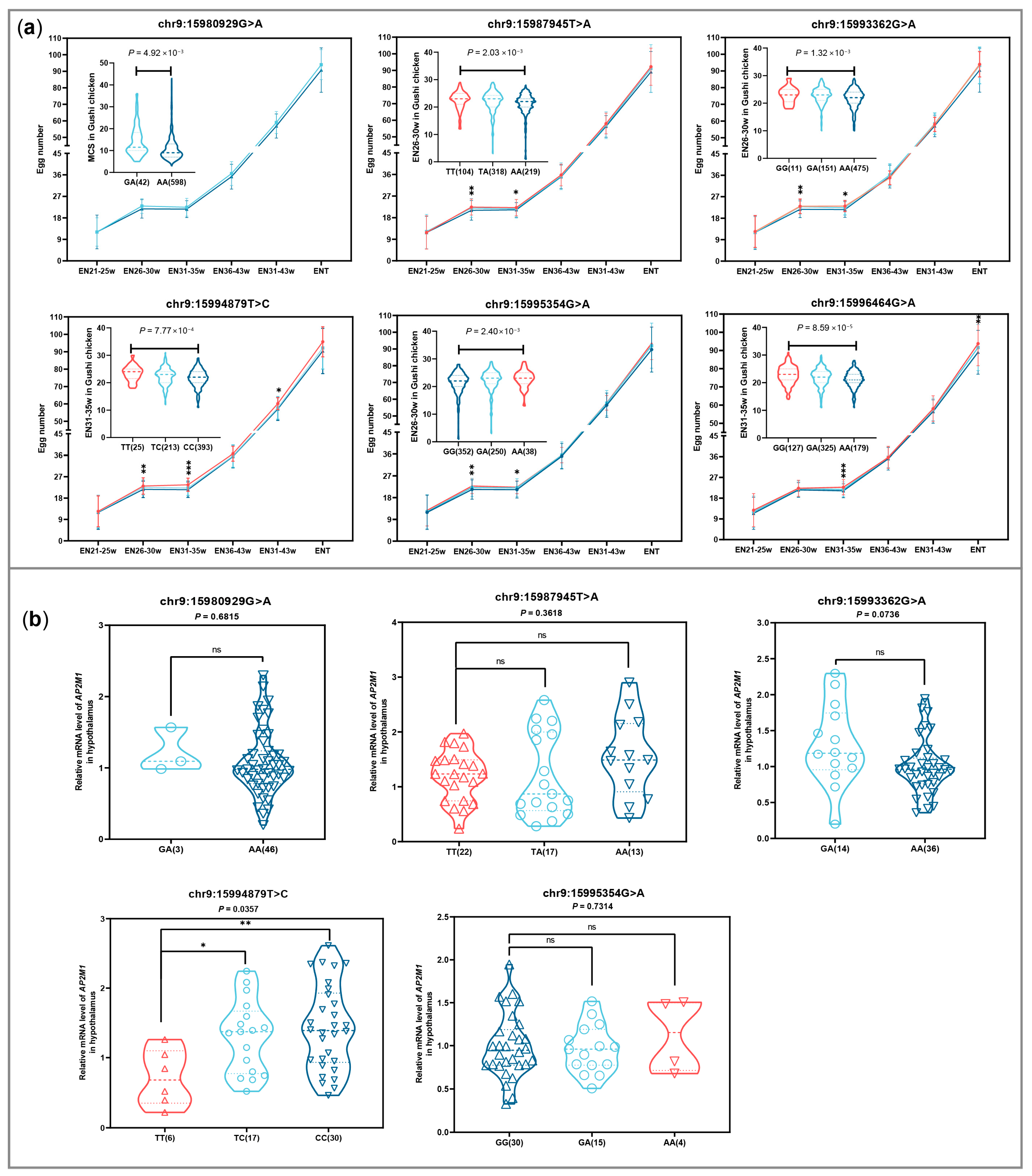 AP2M1 with egg production traits, including egg number (EN) at different laying periods (EN21-25w, EN26-30w, EN31-35w, EN36-43w, EN31-43w, and ENT), average clutch size (ACS) at different laying periods (ACS21-25w, ACS26-30w, ACS31-35w, ACS36-43w, ACS31-43w, and ACST), and maximum clutch size (MCS) in the 12 generations of 900 GS chickens were carried out based on SNP-based GWAS [