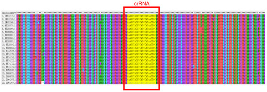We designed all CRISPR RNAs (crRNA) through the Ezassay platform and prioritized top-ranked candidates for preliminary validation. Twenty-two full-length ARV-S1 sequences were retrieved from the NCBI database (Accessed on 23 April 2025 http://www.ncbi.nlm.nih.gov/) and aligned using MEGA software to determine conserved regions (Figure 1). The crRNA is designed to be complementary to a specific target sequence, enabling it to precisely recognize and bind to the corresponding DNA region—namely, the sequence boxed in Table 2. The optimal crRNA sequence was subsequently selected for downstream applications (Table 2). In order to get the best combination of RAA primers and crRNA [35].