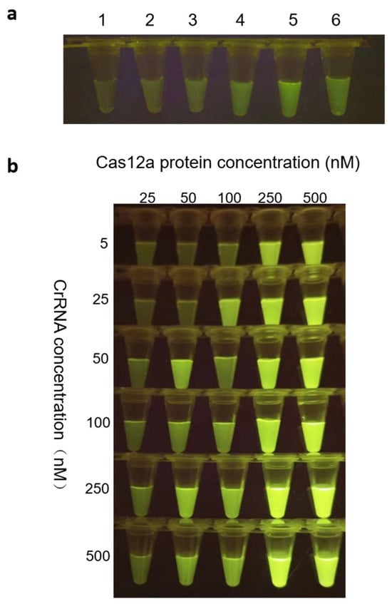 Evaluation of probe concentration and the optimal combination of Cas12a protein and crRNA. (a) Screening optimal probe concentrations of 1. 100 nM, 2. 200 nM, 3. 300 nM, 4. 400 nM, 5. 500 nM, and 6. 600 nM. (b) Screening of the optimal combination of Cas12a protein and crRNA.