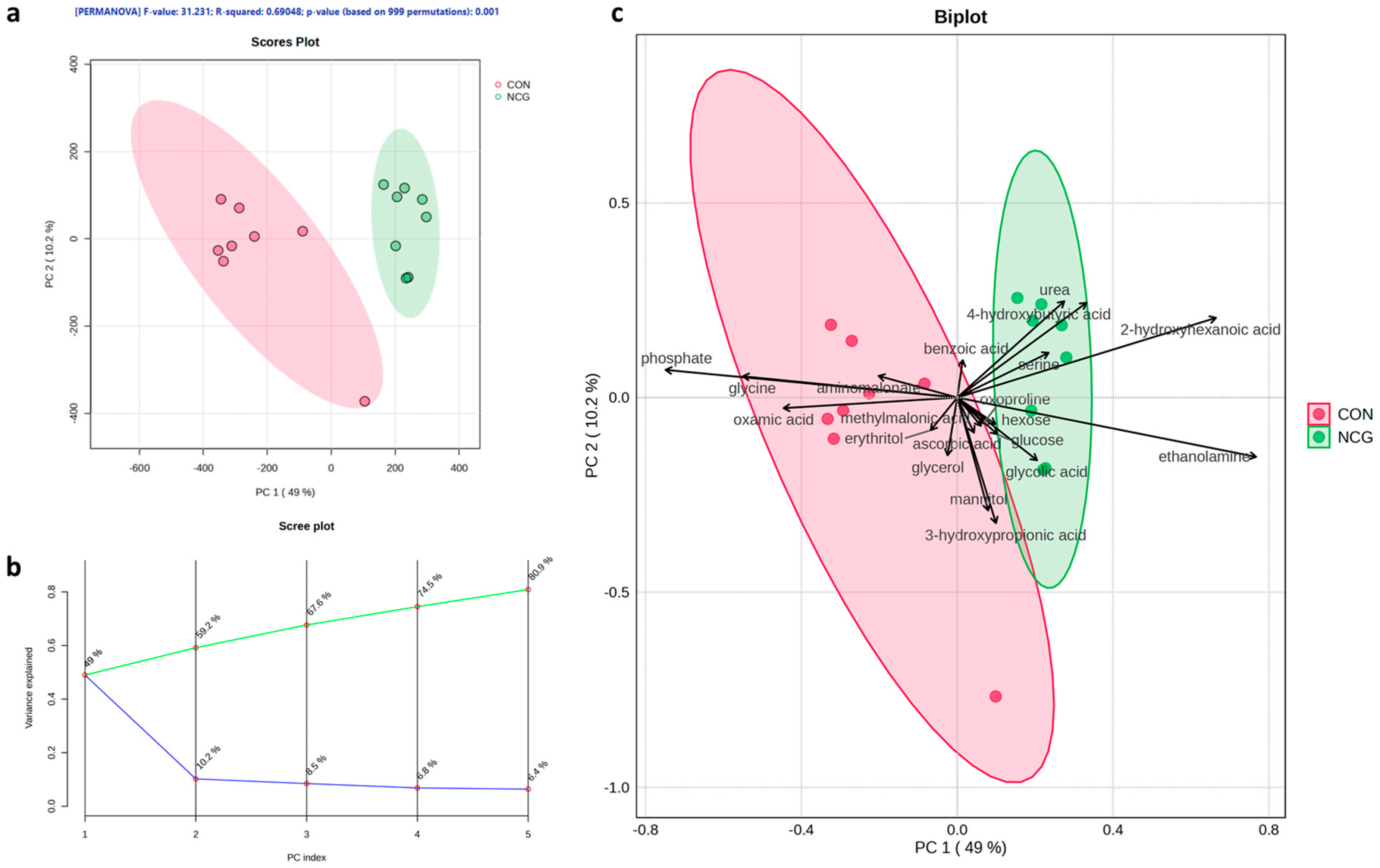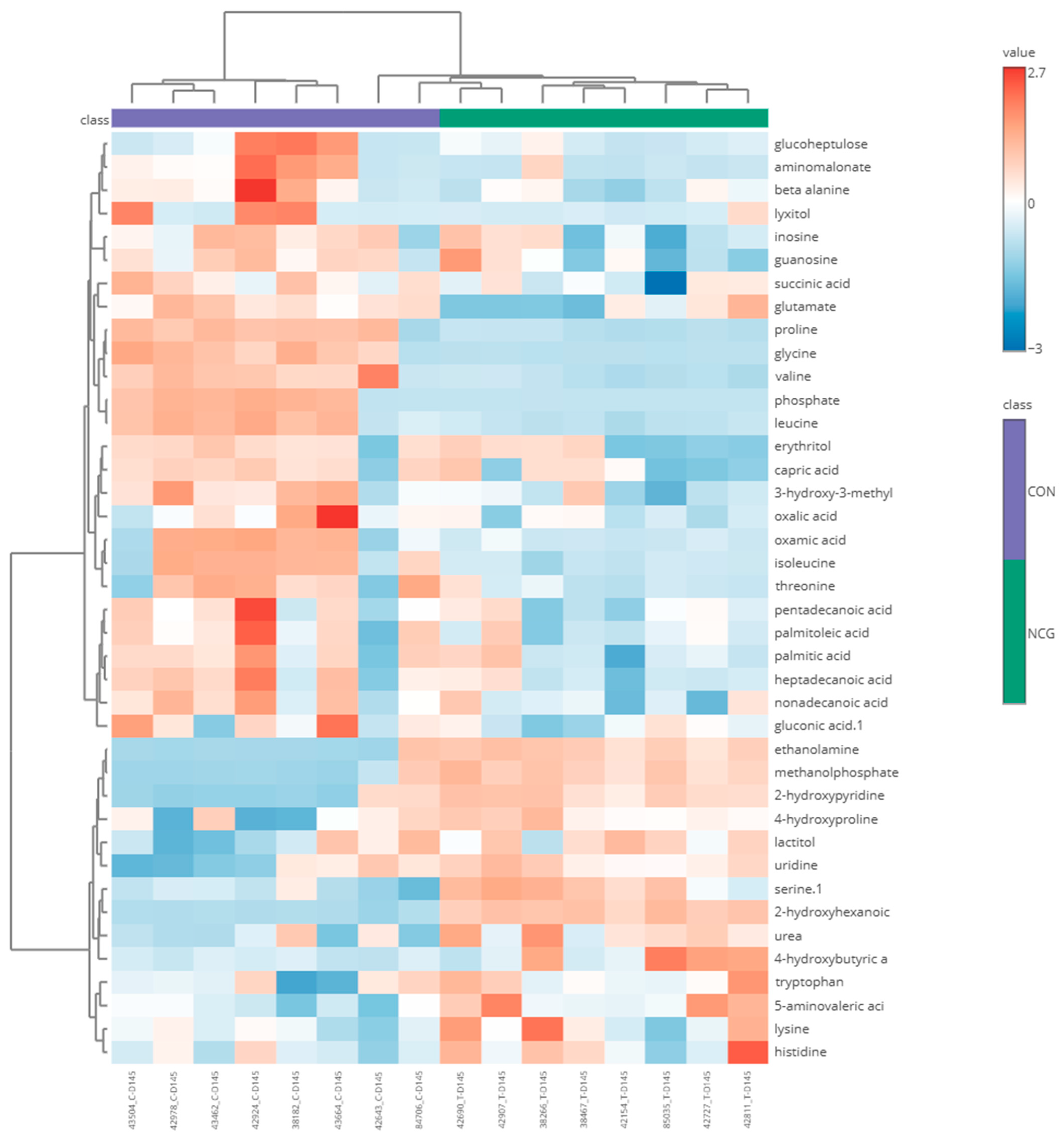 Metabolite | CON | NCG | Percent Difference | p-Value | FDR | Fold Change | log2(FC) |