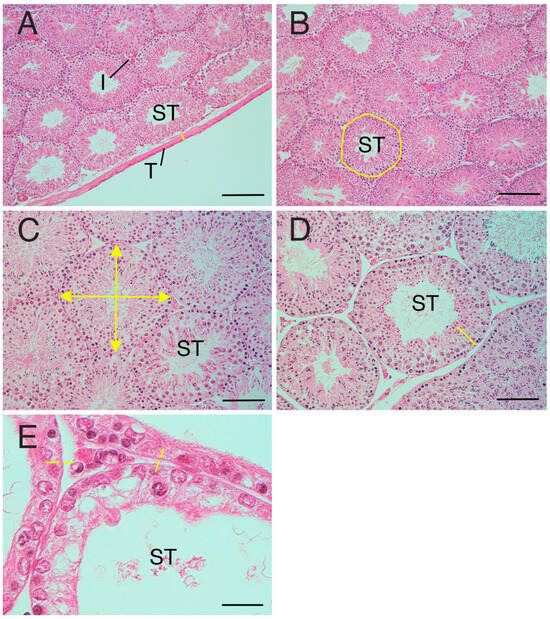 Measurement factors of testicular tissue. (A) Tunica albuginea thickness (arrows). (B) Seminiferous tubule occupancy rate. Area with line: manually selected seminiferous tubule. (C) Diameter of seminiferous tubule (arrow). (D) Cell-layer thickness (arrows) in the seminiferous tubule. (E) Peritubular lamina propria thickness. Arrows: edge of the peritubular lamina propria. I—interstitial area; T—tunica albuginea; ST—seminiferous tubule. Bar: 200 µm (A,B); 100 µm (C,D); 50 µm (E).