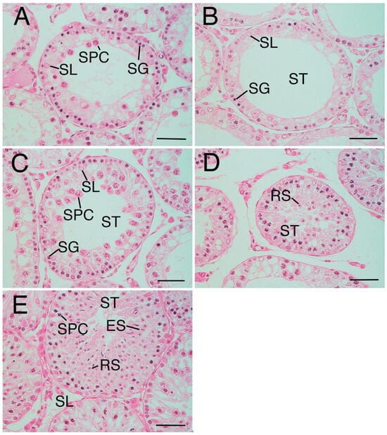 Variation of Johnsen score (JS) in the crypt group. (A) Seminiferous tubule in crypt group (mean Johnsen score (JS): 3.96). The tubule only includes spermatogonia (SG), Sertoli cells (SL), and a few spermatocytes (SPC), not spermatid or sperm. (B) Seminiferous tubule in crypt group (mean JS:2.93). The tubule only includes SG and SL, not SPC, spermatid, or sperm. (C) Seminiferous tubule in the crypt group (mean JS:5.43). (D) Same tissue sample as (C). Round spermatid (RS) was also observed. The tubule only includes SG, SL, and many SPC, not elongated spermatid or sperm. (E) Seminiferous tubule in crypt group (mean JS:6.97). Complete spermatogenesis. ST—seminiferous tubule. Bar: 50 µm.