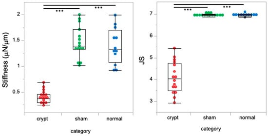 Relationship between JS and stiffness values. Red: crypt group, green: sham group, blue: normal group, ***: p < 0.0001.