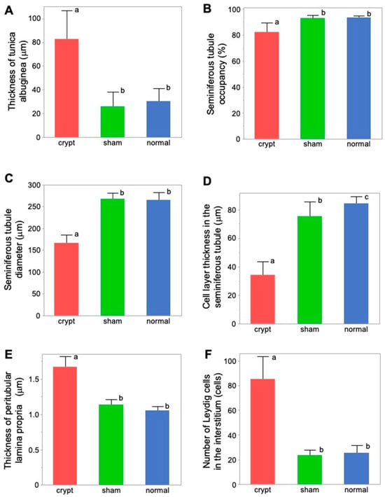 Comparison of the measurement factors of testicular tissues among 3 groups. (A) Tunica albuginea thickness. (B) Seminiferous tubule occupancy rate. (C) Seminiferous tubule diameter. (D) Cell-layer thickness in the seminiferous tubule. (E) Thickness of peritubular lamina propria. (F) Number of Leydig cells. Different letters represent significant differences among different signs (p < 0.05).