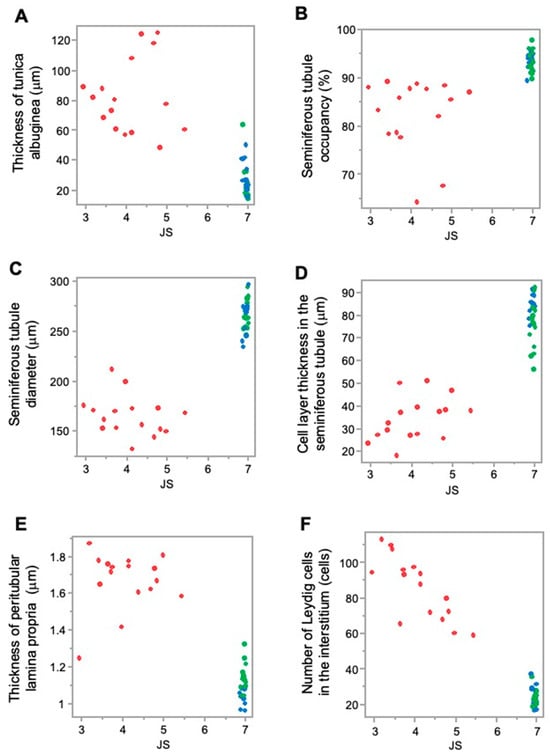 Relationship between the measurement factors of testicular tissues and JS. (A) Tunica albuginea thickness; (B) seminiferous tubule occupancy rate; (C) seminiferous tubule diameter; (D) cell-layer thickness in the seminiferous tubule; (E) thickness of peritubular lamina propria; and (F) number of Leydig cells. Red: crypt group, green: sham group, blue: normal group.