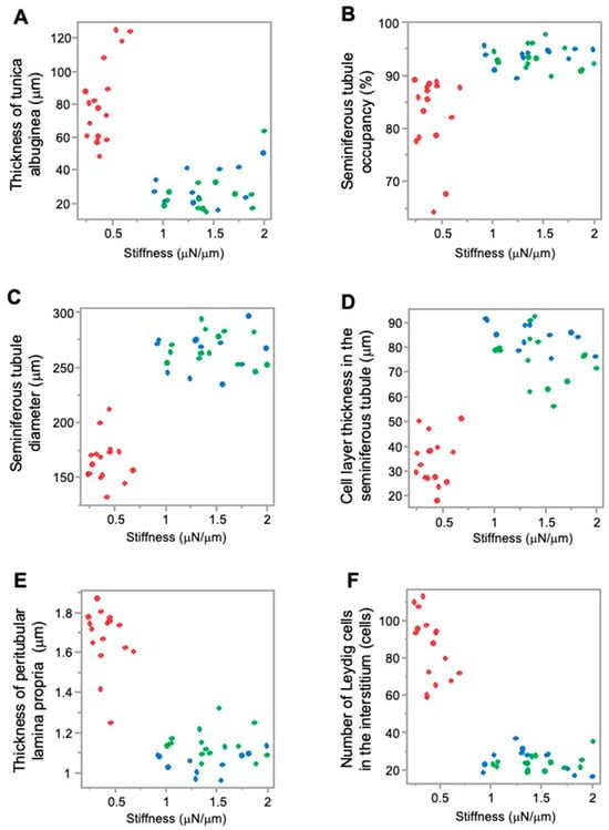 Relationship between the measurement factors of testicular tissues and stiffness. (A) Tunica albuginea thickness; (B) seminiferous tubule occupancy rate; (C) seminiferous tubule diameter; (D) cell-layer thickness in the seminiferous tubule; (E) thickness of peritubular lamina propria; (F) number of Leydig cells. Red: crypt group, green: sham group, blue: normal group.
