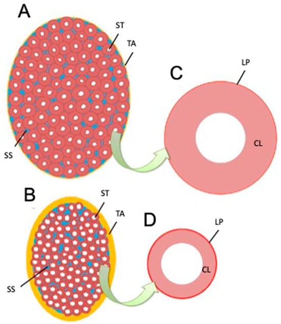 Schematic drawing of testis and seminiferous tubule cross-sections based on measurement results. (A) Longitudinal section of the testis in an animal showing normal spermatogenesis. (B) Longitudinal sections of testes in animals showing abnormalities. (C) Section of seminiferous tubules in (A). (D) Section of seminiferous tubules in (B). ST—seminiferous tubule, SS—interstitial (blue), TA—tunica albuginea (yellow), LP—peritubular lamina propria (red), CL—cell layer in the seminiferous tubule.