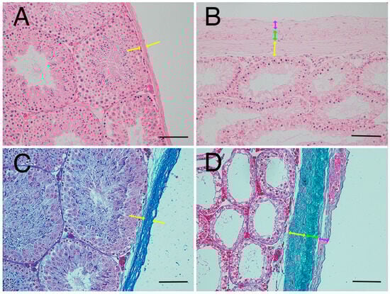 The tunica albuginea is a dense fibrous connective tissue composed mainly of collagen fibres present on the surface of the testis (Figure 1A). In instances where the tunica albuginea was partially detached or lost during sectioning, areas adjacent to the testicular parenchyma were selected and used for the measurements. The thickness of the testicular tunica albuginea was measured at 10 locations per sample, and the average was calculated.