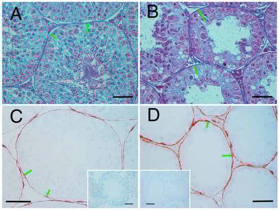 Seminiferous tubule wall. Azan stain: (A) normal group and (B) crypt group. Arrowheads indicate the appearance of collagen fibres. αSMA immunostaining; (C) normal group and (D) crypt group. Insets: negative control. Arrowheads show the myoid cells. Bar: 50 µm.