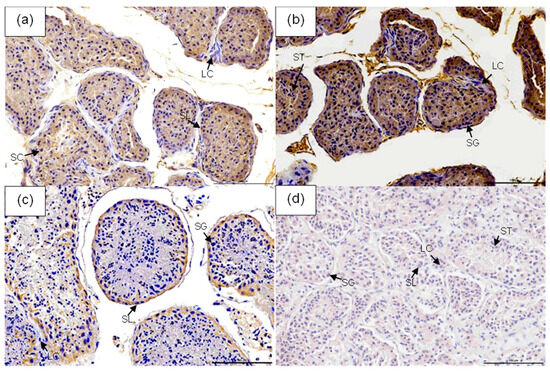 Immunohistochemical detection of GLUT-5 protein in the testes throughout July (a), August (b), and September (c). Negative control (d). Scale bars: 100 μm. LC = Leydig cell; SL = Sertoli cell; SG = Spermatogonium; SC = Spermatocyte; ST = Spermatid.