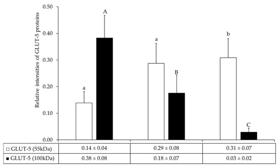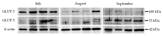 The expression of GLUT-5 proteins varied across months. The relative intensity of GLUT-5 protein (55 kDa) was lowest in July (0.14 ± 0.04) and highest in September (0.31 ± 0.07) (Figure 3), while the expression of GLUT-5 (55 kDa) was significantly higher in testis samples collected in September compared to those collected in July (p < 0.05) (Figure 3). In contrast, the relative intensity of GLUT-5 protein (100 kDa) was highest in July (0.38 ± 0.08) and declined in August (0.18 ± 0.07) and September (0.03 ± 0.02), while GLUT-5 (100 kDa) expression was significantly higher in testis samples collected in July than in those collected in August and September (p < 0.05) (Figure 3).