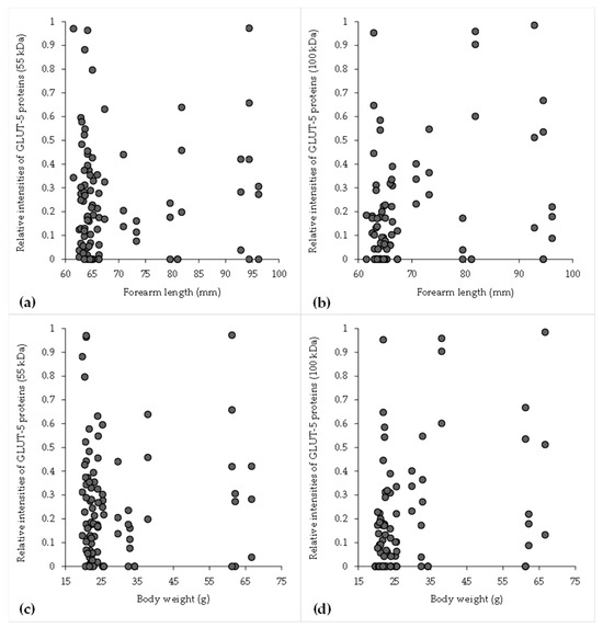 The scatter plot illustrates the correlation between GLUT-5 protein expression (55 kDa and 100 kDa), as determined by Western immunoblotting, and bat forearm length (mm) for 55 kDa (a) and 100 kDa (b), as well as body weight (g) for 55 kDa (c) and 100 kDa (d).