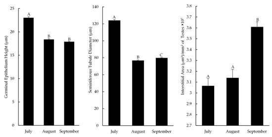 As illustrated in Figure 5, the height of the germinal epithelium in the testicular tissue of roundleaf bats was significantly higher in July compared to August and September. Likewise, the diameter of the seminiferous tubules was significantly greater in July, but it increased in September compared to August. In contrast, the interstitial area of the testicular tissue was significantly larger in September than in both July and August.