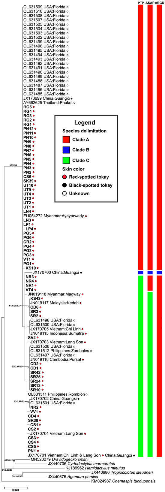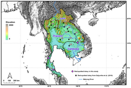 - Saijuntha, W.; Sedlak, S.; Agatsuma, T.; Jongsomchai, K.; Pilap, W.; Kongbuntad, W.; Tawong, W.; Suksavate, W.; Petney, T.N.; Tantrawatpan, C. Genetic Structure of the Red-Spotted Tokay Gecko, Gekko gecko (Linnaeus, 1758) (Squamata: Gekkonidae) from Mainland Southeast Asia. Asian Herpetol. Res. 2019, 10, 69–78. [Google Scholar]