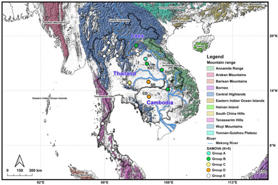 - Dupanloup, I.; Schneider, S.; Excoffier, L. A simulated annealing approach to define the genetic structure of populations. Mol. Ecol. 2002, 11, 2571–2581. [Google Scholar] [CrossRef]