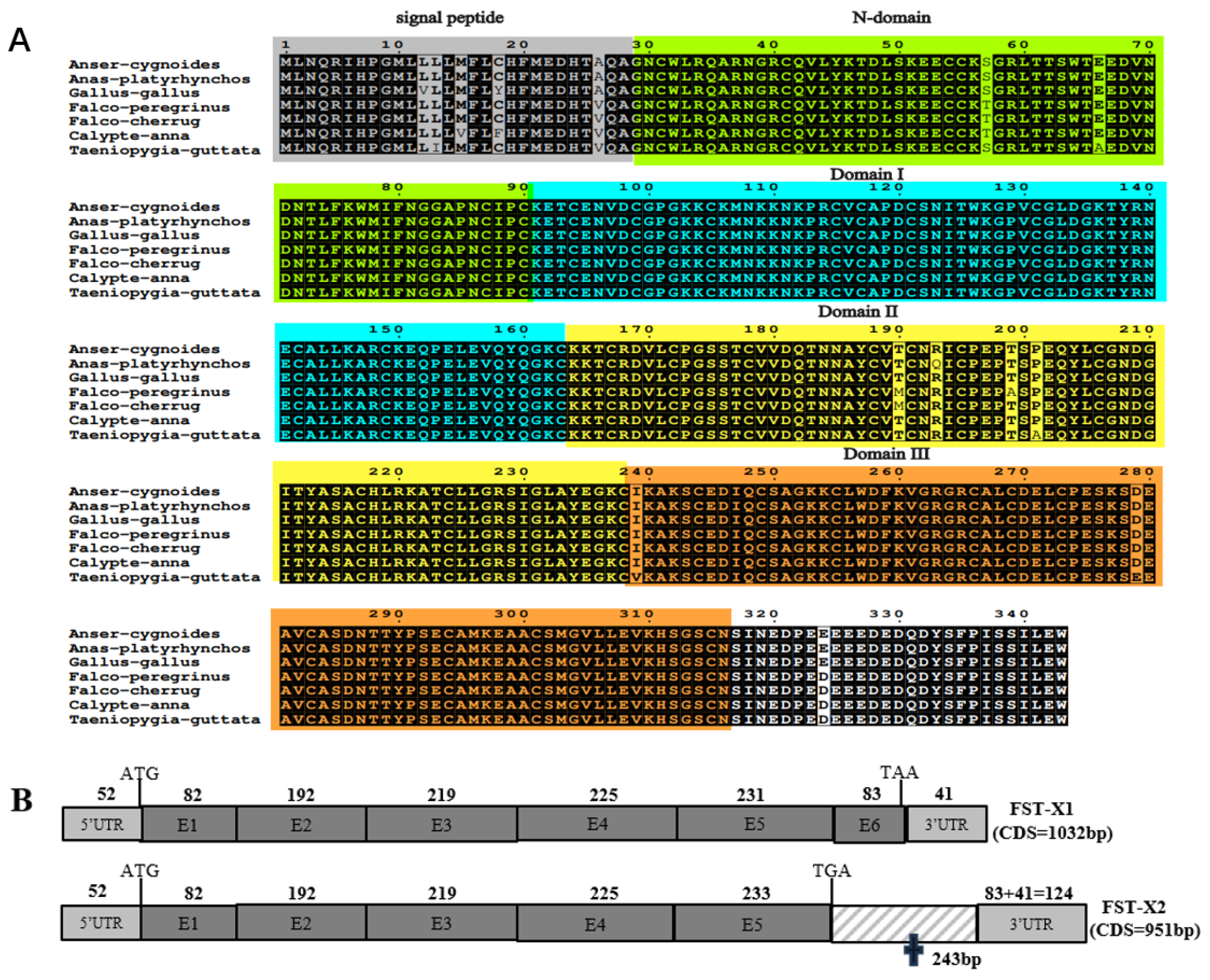 - Dushyanth, K.; Shukla, R.; Chatterjee, R.N.; Bhattacharya, T.K. Expression and polymorphism of Follistatin (FST) gene and its association with growth traits in native and exotic chicken. Anim. Biotechnol. 2022, 33, 824–834. [Google Scholar] [CrossRef] [PubMed]
