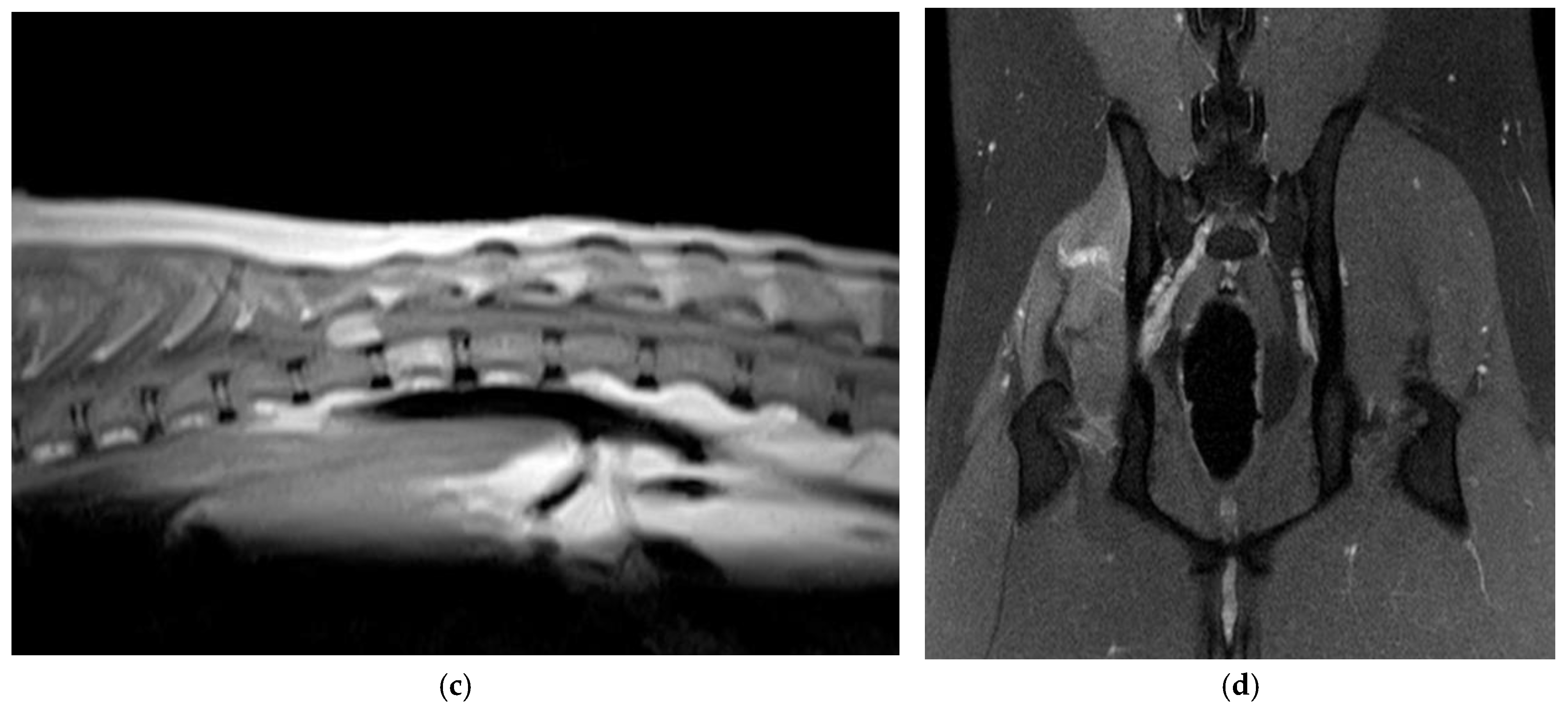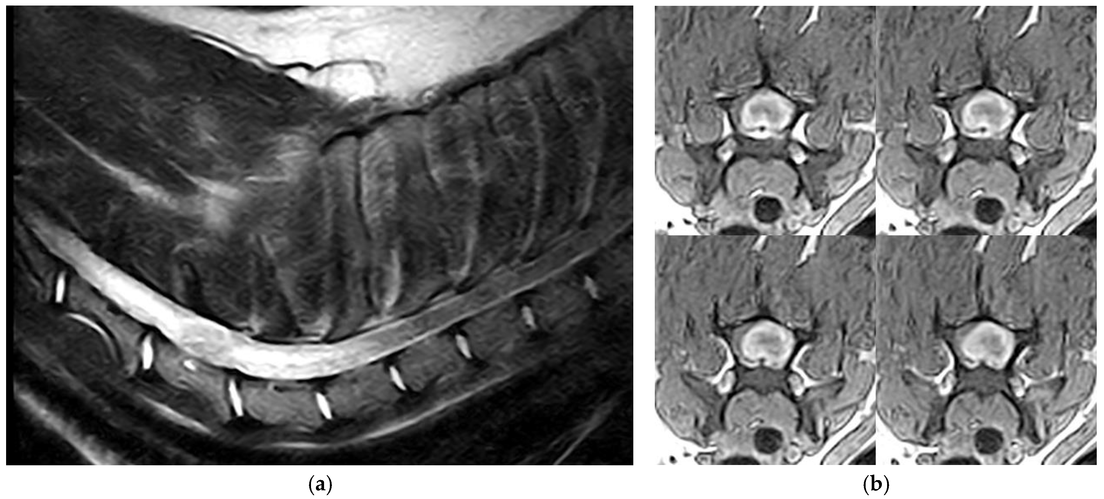 - Jull, P.; Walmsley, G.L.; Benigni, L.; Wenzlow, N.; Rayner, E.L.; Summers, B.A.; Cherubini, G.B.; Schöniger, S.; Volk, H.A. Imaging diagnosis--spinal cord hemangioma in two dogs. Vet. Radiol. Ultrasound 2011, 52, 653–657. [Google Scholar] [CrossRef] [PubMed]