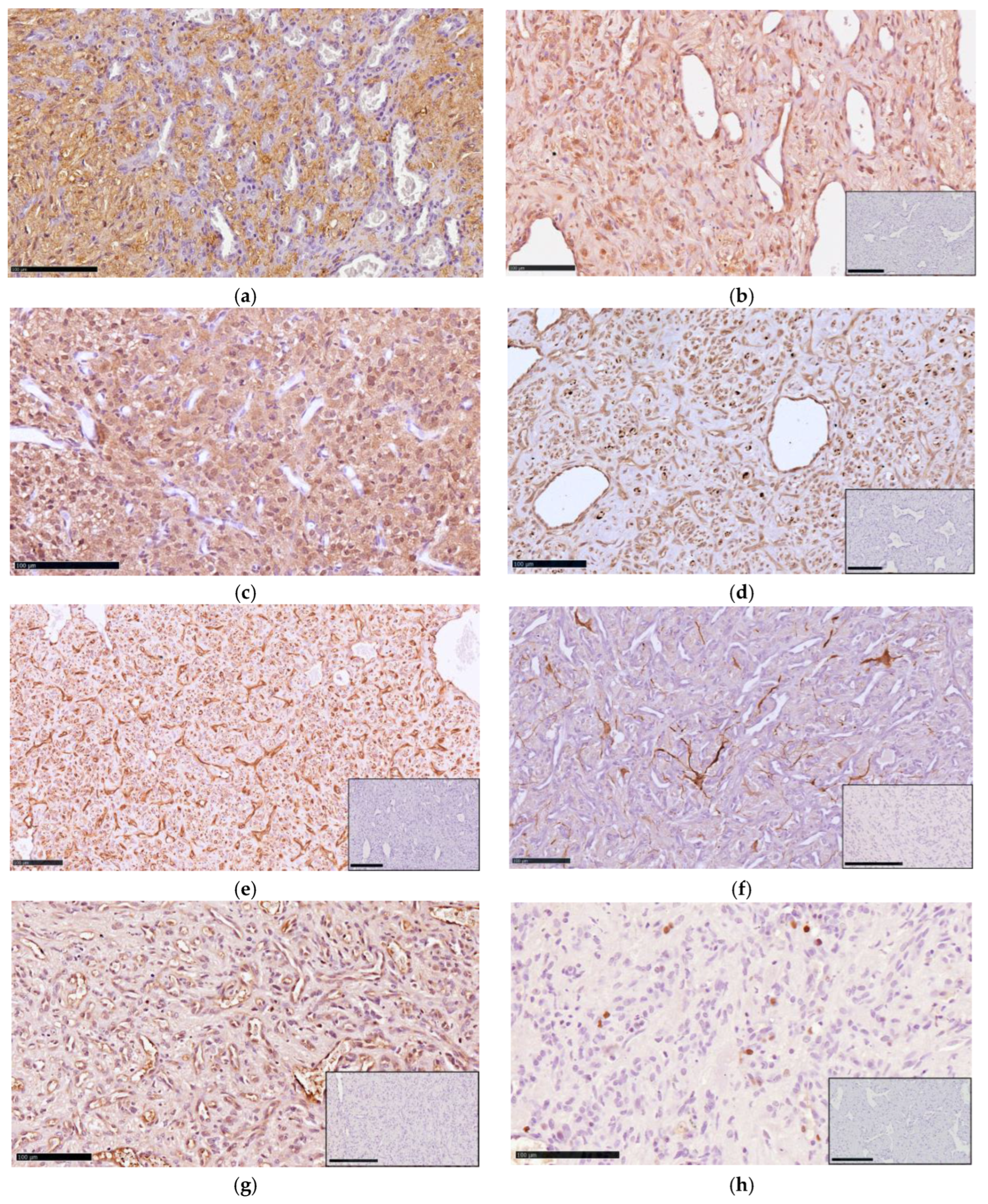 - Frank, T.S.; Trojanowski, J.Q.; Roberts, S.A.; Brooks, J.J. A detailed immunohistochemical analysis of cerebellar hemangioblastoma: An undifferentiated mesenchymal tumor. Mod. Pathol. 1989, 2, 638–651. [Google Scholar] [PubMed]