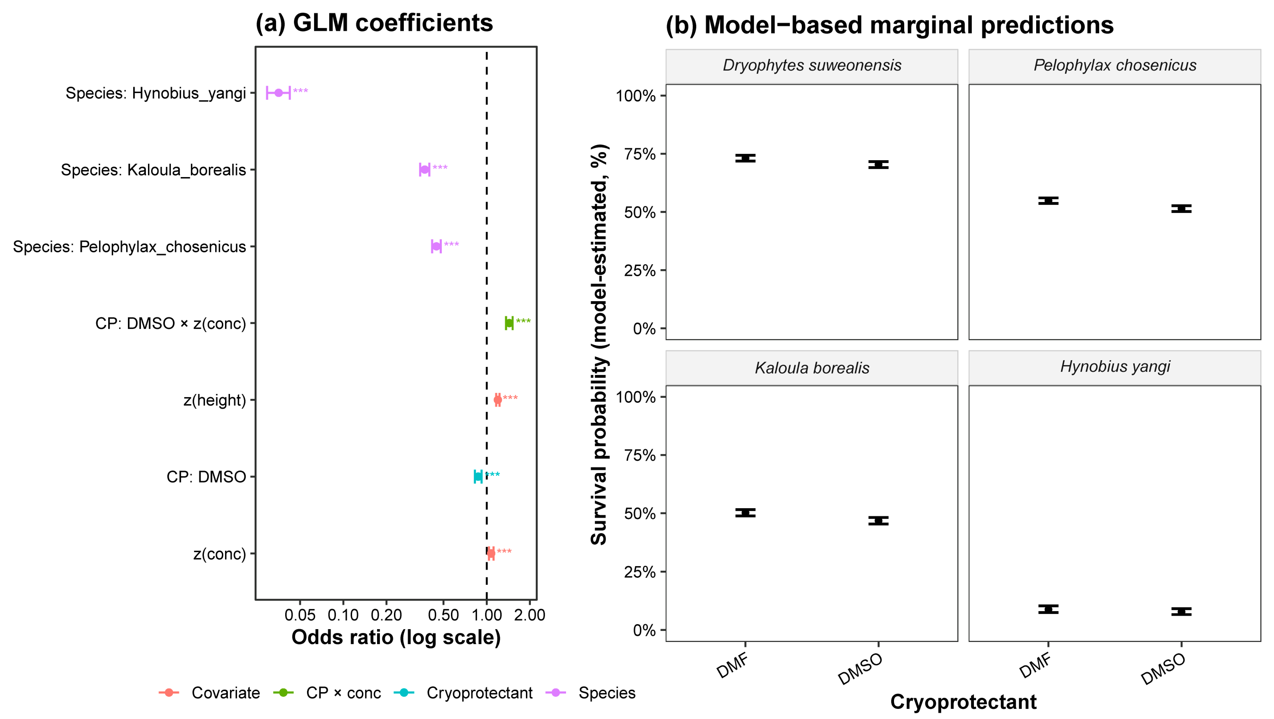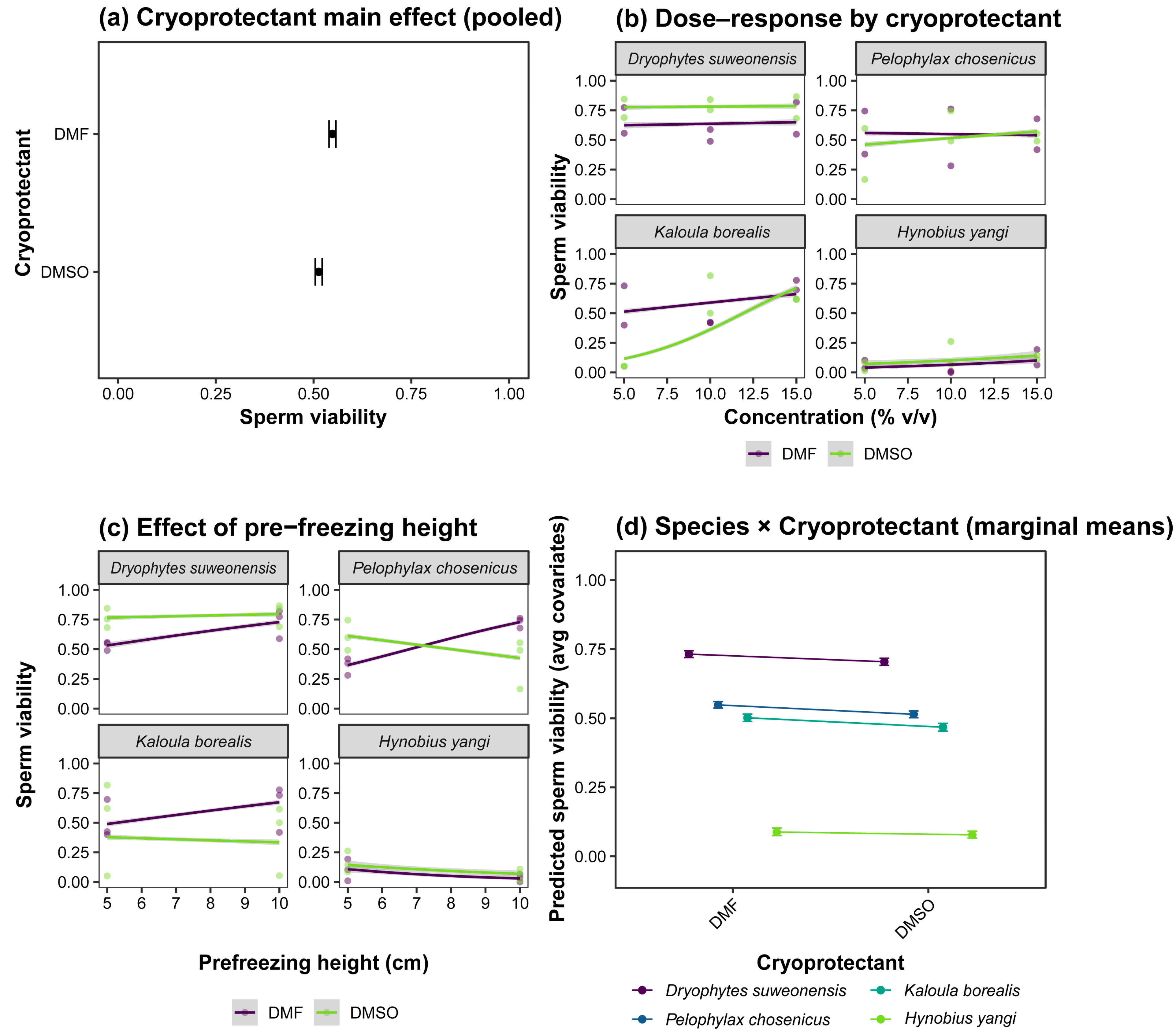 | Species | Condition | Cryoprotectant | Mean ± SE (%) | 95% CI (%) | Total (Cells) | No. of Individuals | Straws Per Conditions |
