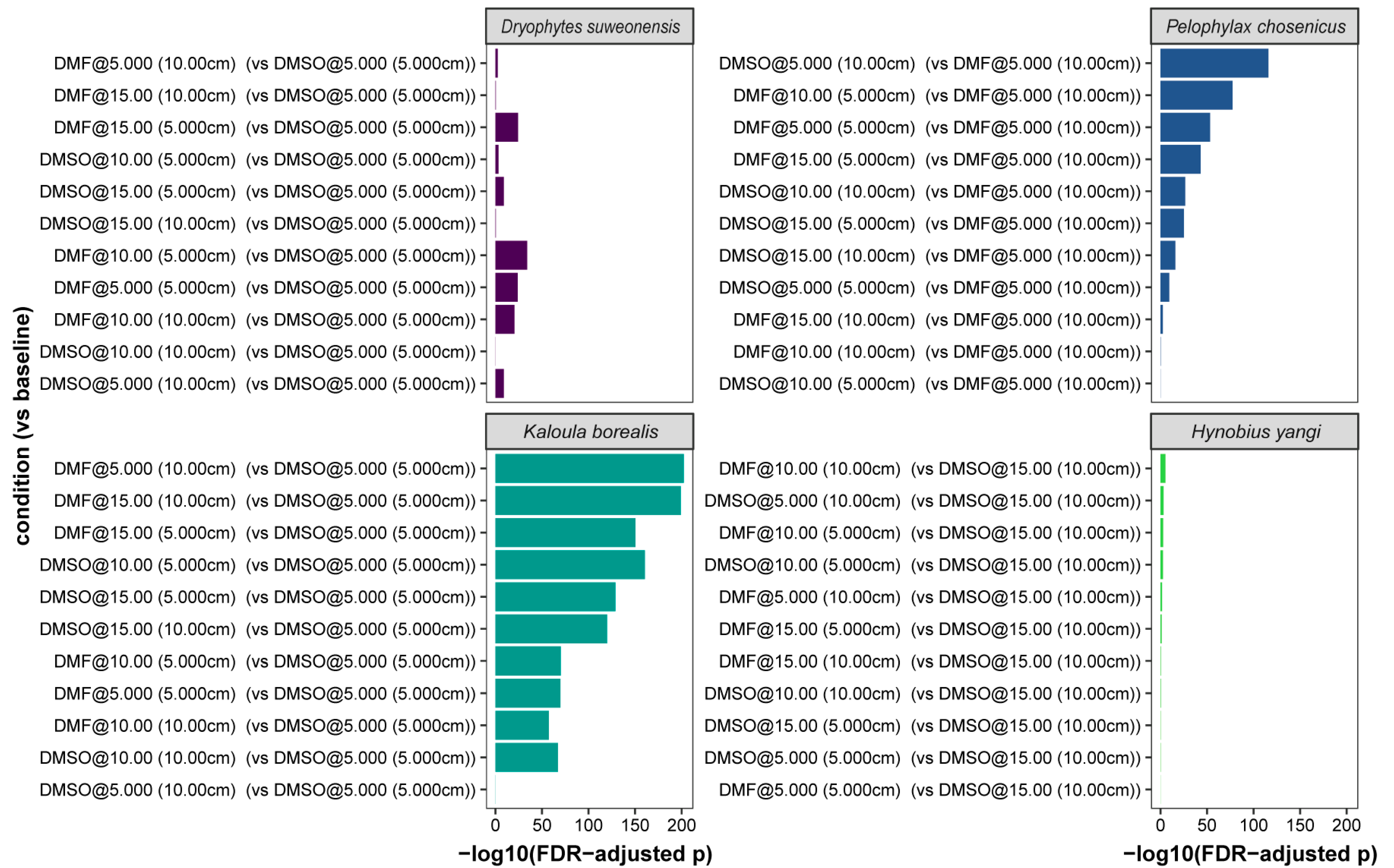 | Dryophytes suweonensis | DMF@5.000 (10.00 cm) | DMSO@5.000 (5.000 cm) | 77.4 (73.6 ± 0.7) | 84.4 (81.2–87.2) | 0.63 [0.46–0.86] | 0.003 | 0.004 | ** |