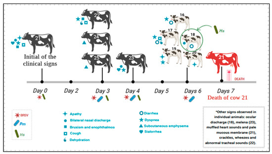 Sequential events observed during an outbreak of respiratory disease affecting adult dairy cows and calves from Southern Brazil. The numbers of the affected animals are provided. *—clinical manifestations reported by the consulting veterinarian. X—cow that died without organs evaluated. Cow # 21 died during the visit to the farm.