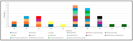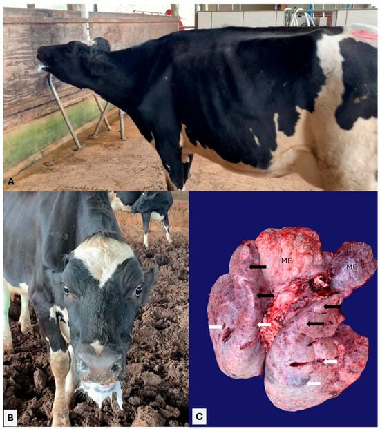 All clinical manifestations observed in the animals evaluated during this outbreak are summarized in Figure 2. Overall, adult dairy cows were more severely affected relative to dairy calves, with cows #21 and 22 being more severely affected. Dyspnea was the most frequent clinical manifestation observed, being identified in cows #21, 22, and 23 as well as in calves #16, 17, and 19. The cow (#21) that died spontaneously typical clinical signs of severe dyspnea, including a stretched neck, grunting during expiration, open-mouth breathing, and frothy oral secretions (Figure 3A,B); auscultation revealed bilateral crackles and wheezes and muffled heart sounds. Cow #23 with dyspnea was the only animal with melena. Cutaneous swelling that was interpreted as subcutaneous emphysema was reported in cows #24 and 25.