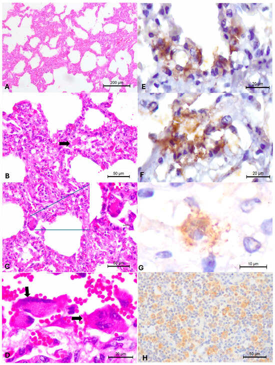 Histopathological and immunohistochemical findings observed in a cow that died of respiratory distress. Observed interstitial pneumonia due to the thickening of alveolar septa without the accumulation of neutrophilic exudate (A); a closer view is provided (B), containing a multinucleated syncytial (arrow) within the thickened alveolar wall. Intralesional syncytial formation is also demonstrated with a closer provided at the insert (C); there are several syncytial cells (arrows) lining the alveolar wall (D). There is positive intracytoplasmic immunoreactivity to BRSV antigens within epithelial cells of bronchiole (E), and multinucleated giant cells (F) of the lungs, as well as within hepatocytes (G) and the peribronchial lymph node (H). Hematoxylin and eosin stain (A–D); immunoperoxidase counterstained with Hematoxylin (E–H). Bars: (A), 200 µm; (B,C,H), 50 µm; (D–F), 20 µm; (G), 10 µm.