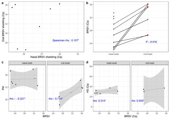 Correlation between nasal and oral shedding of the different respiratory pathogens. (a) Spearman correlation between oral and nasal Bovine Respiratory Syncytial Virus (BRSV) shedding (*: not statistically significant). (b) Paired samples analysis comparison of nasal and oral BRSV Cq (Paired Wilcoxon test p-value). (c) Spearman correlation between Pasteurella multocida (PM) and BRSV shedding in oral and nasal swabs. (d) Spearman correlation between Histophilus somni (HS) and BRSV shedding in oral and nasal swabs.