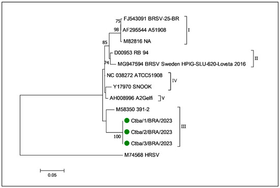 The amplicons were purified using HT ExoSAP-IT (Thermo Fisher Scientific, Austin, TX, USA) according to the manufacturer’s instructions. The purified amplicons were sequenced in both directions using the BigDye Terminator kit v. 31 (Thermo Fisher Scientific, Austin, TX, USA) and cleaned up with BigDye Xterminator v. 3.1. (Applied Biosystems, Foster City, CA, USA). The purified products of the cycle sequencing were analyzed on the ABI 3130xl Genetic Analyser (Applied Biosystems, Foster City, CA, USA). The phylogenetic analyses were performed by using the Maximum Likelihood method with the partial (422 nt) F gene sequences of BRSV deposited in GenBank. Sequence quality analyses and consensus sequences were obtained using Phred and CAP3 homepages, respectively (http://asparagin.cenargen.embrapa.br/phph/, accessed on 8 October 2025). Similarity searches were performed with nt sequences deposited in the GenBank database using the Basic Local Alignment Search Tool (BLAST) homepage (http://blast.ncbi.nlm.nih.gov/Blast.cgi, accessed on 8 October 2025). Multiple and pairwise alignments with strains available in GenBank were performed with MEGA software version 7.0.26 [42]. The phylogenetic tree was based on nucleotide (nt) sequences using the maximum-likelihood method and Tamura & Nei model [43], which provided statistical support with 1000 bootstrap replicates using the MEGA package (version 7.0) [42]. Sequence identity matrices were performed using the BioEdit software version 7.2.5 [44].