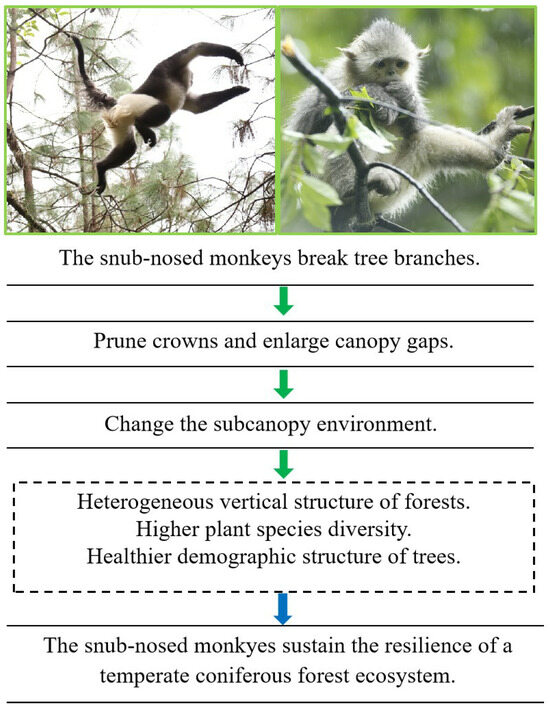 This study highlights the critical ecological role of the black-and-white snub-nosed monkey as an ecosystem engineer in temperate coniferous forests of the Yunling Mountains. Field observations and forest structural analysis prove that the monkey’s branch-breaking behavior have changed the forest structure obviously. These activities maintain a heterogeneous vegetation structure and a pyramidal age distribution of trees, thereby increasing ecosystem resilience and stability. Although the positive ecological effects of the monkeys can persist for up to 20 years after their disappearance, long-term absence results in reduced regeneration, sapling density, and overall forest health.